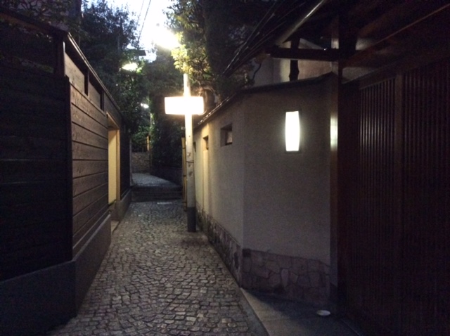 路地の石畳:照明は少ないが、石畳に光が反射している。奥には階段があるのだが、手前からでは良く見えない。先の路も見えず、回遊性がある。 -