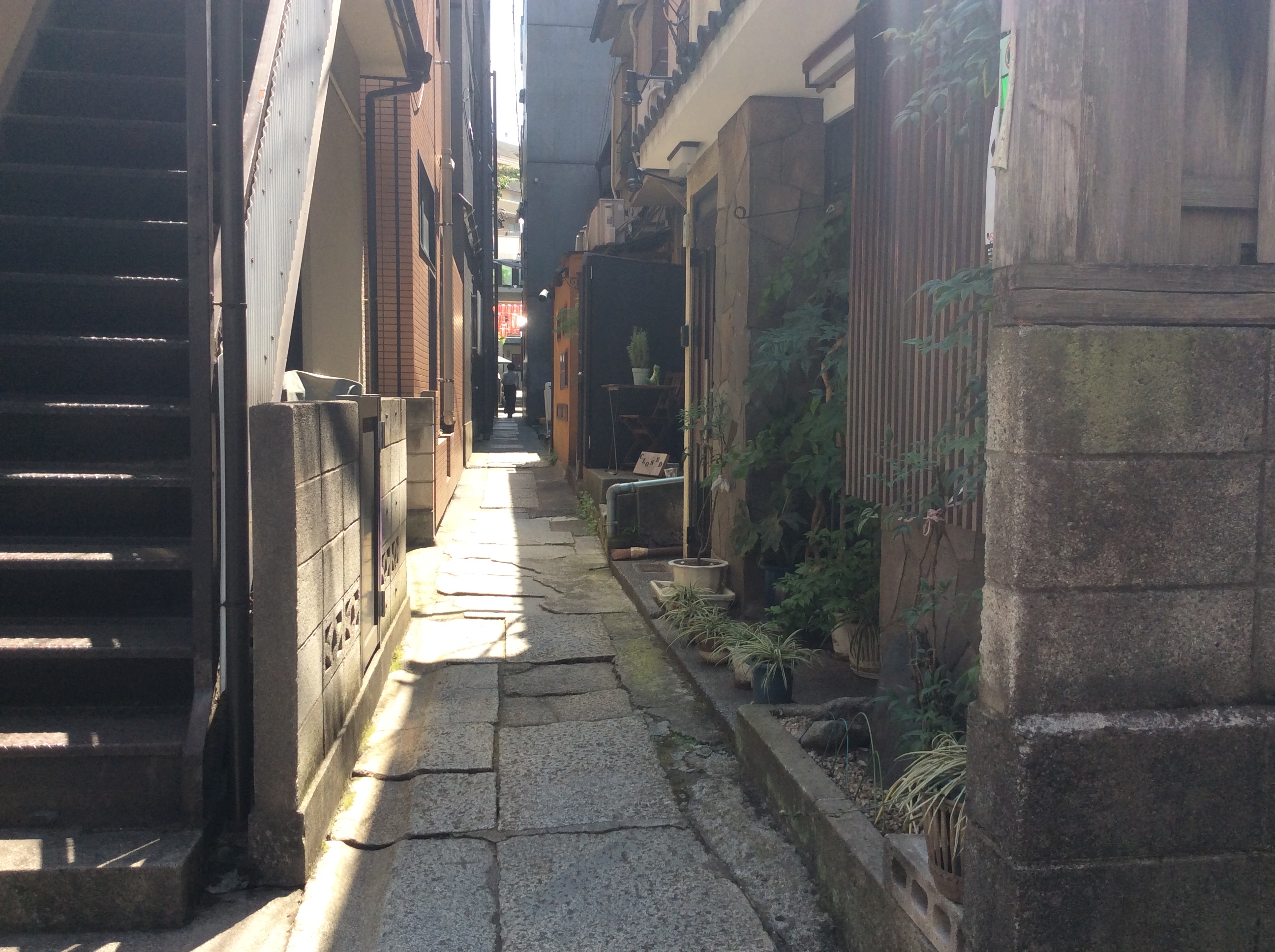 昼間の路地:形の整っていない石畳。高さも合っていないため、歩きづらさがあるものの、風情を感じる場所でもある。一人で通るだけの道幅だがお店があり、驚かされる。 -