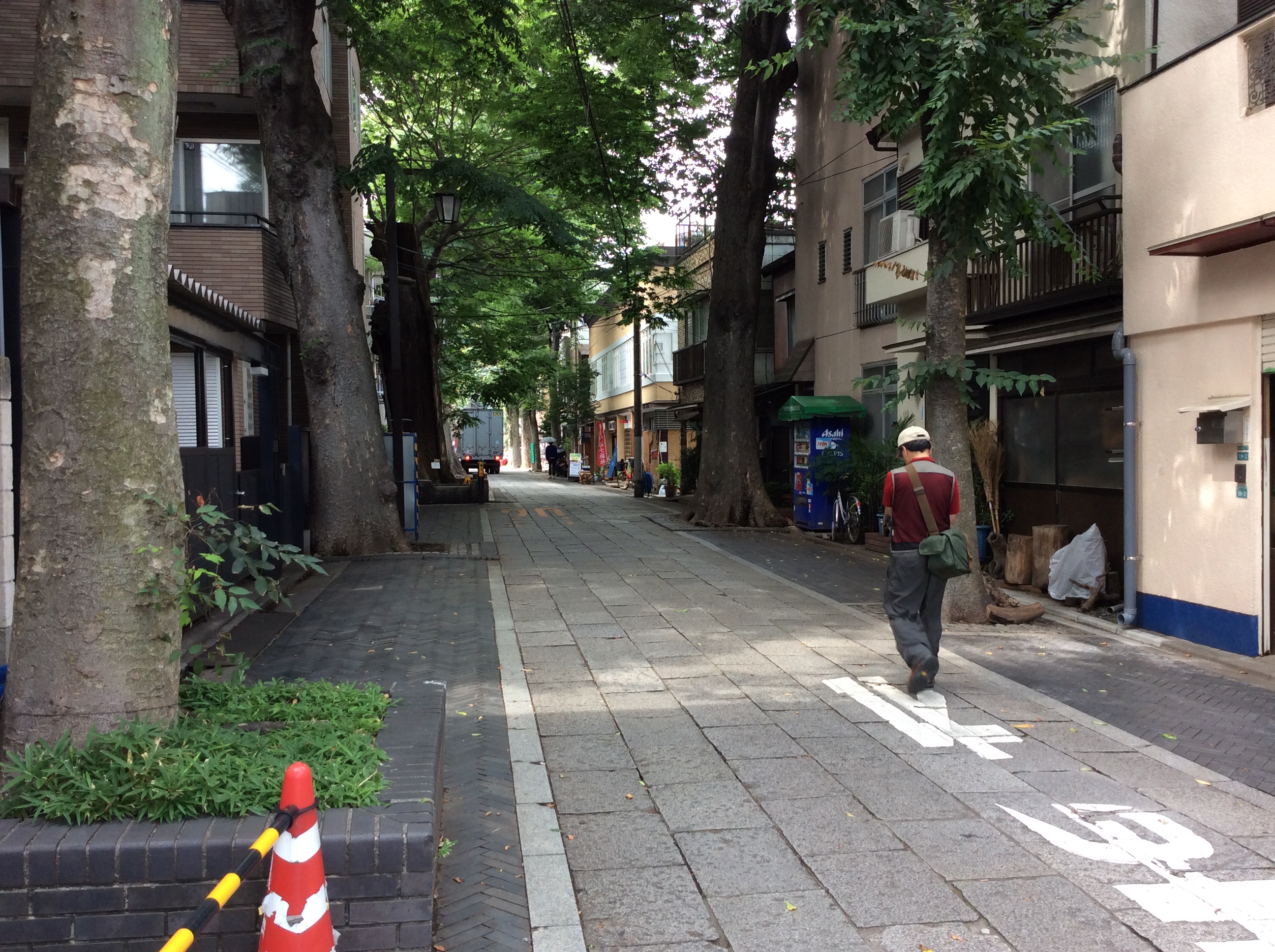 雑司ヶ谷の大門ケヤキ並木道:神楽坂と比べると人や車はかなり少ない。自然は多く、住宅街でもあることからか、ゴミも少なく綺麗になっている。この石畳とケヤキ並木を通り、左へ曲がると鬼子母神へと繋がる。