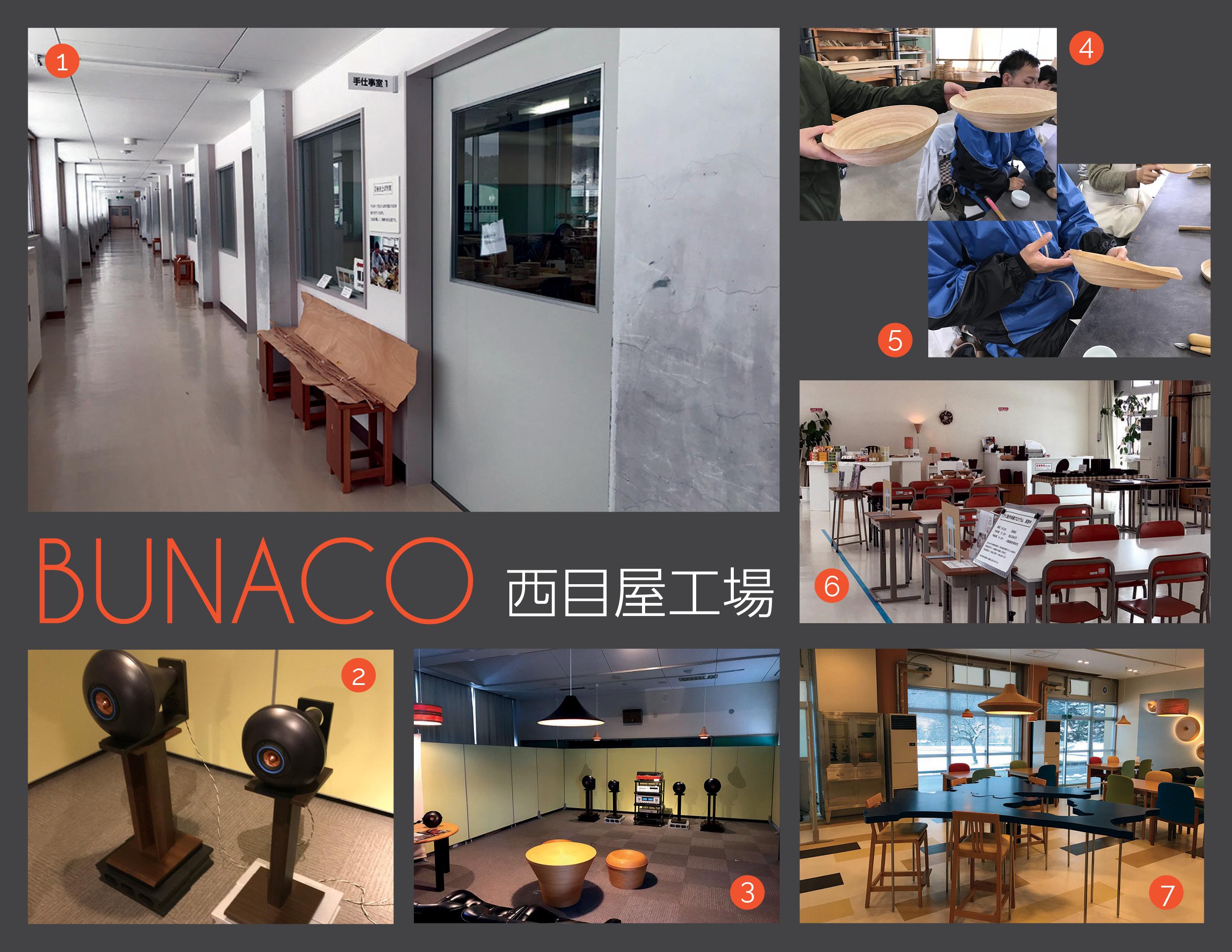 ブナコは青森に群生するブナ材を有効活用するため、1956年に青森県工業試験場長、城倉氏と漆職人、石郷氏の共同研究により生み出された。その後、1963年に現社長、倉田昌直氏の父親がそこより特許を譲り受け、ブナコ漆器製造株式会社を設立した。また、同試験場に勤務していた望月氏によりモダンな形状に生まれ変わる。1980年に現社長、倉田氏が会社を引き継いだ時、大胆な製品のリニューアルに着手し、そこで考案されたのが今までに無いワインレッドカラーの漆器「あかねのうつわ」である。これは1982年の見本市に出品した所、注目されロングセラー商品となるが、この商品の売れ行きが伸び悩み始める。そこにランプシェード制作の依頼があり、この時よりBUNACOはインテリア事業及びランプシェード制作へと経営を大きく転換させる。この時ランプシェードのデザインを手がけたデザイナーにより2003年のギフトショーでBUNACO RED(註7)を発表する。このBUNACO REDは六本木ヒルズTORAYA CAFEの照明に採用されている。2007年には青森県初の地域資源活用プログラムの認定を受ける。この頃よりBUNACOは海外という市場を意識し始める。2008年、安積伸氏デザインによる「Yauatcha Tea Set」が英国Homes&Gardens Classic Design Award受賞、同作品は英国国立ヴィクトリア・アンド・アルバート博物館永久収蔵品となる。(註3・⑥)。またパリのMaison et Objetに出展し、毎年展示ブースを出している(註4)。2013年には社名をブナコ株式会社と改める。2014年、リッツカールトン京都で照明が採用される。青森県津軽地方スターバックス3店舗(註5・①)と、ユナイテッド・シネマ豊洲での照明採用。同社はその間にグッドデザイン賞を2007年、2009年に受賞。2012年には県内初のグッドデザイン・ロングライフデザイン賞(註3・④)を受賞。更に県内多所にて照明が採用されている。2015年からはフランスにある工場に日本から輸出したランプシェードとフランス国内で生産した照明器具とを組み立てる委託契約を結んだ。そして2017年、日本でのランプシェード生産を本格化させるため本社がある弘前から少し離れた西目屋村に廃校を利用した工場を開設した。そこでは見学、製作体験、が出来る他、ブナコカフェが併設されている(註2・①、⑥&⑦)。またスタイリッシュなオリジナルスピーカーFaggio(註2・②&③)も見学、視聴できる展示ルームも設けている。