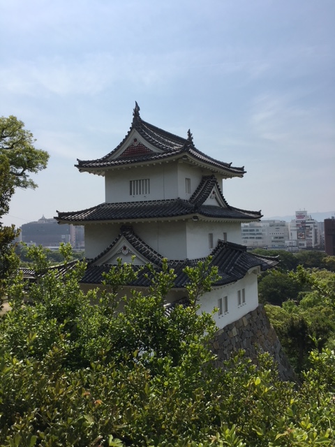 天守台より撮影。昭和55年には解体修理が行われた。しかしその後の阪神大震災で土台石垣の落下など大きな被害を被った。できるだけ元の建築法を残す形で耐震化がおこなわれた。坤櫓の建築には伏見城の廃材が使われた。(平成30年5月1日撮影)