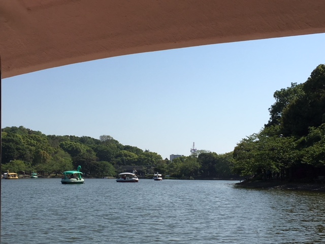 池のボートより撮影。剛之池は明石城の西北に位置する。かつては、外堀の代わりに防衛に役立っていた。現在は家族連れがボート遊びを楽しんでいる。春には、池の周囲の桜が美しく咲き、花見客で賑わう。(平成30年4月30日撮影)
