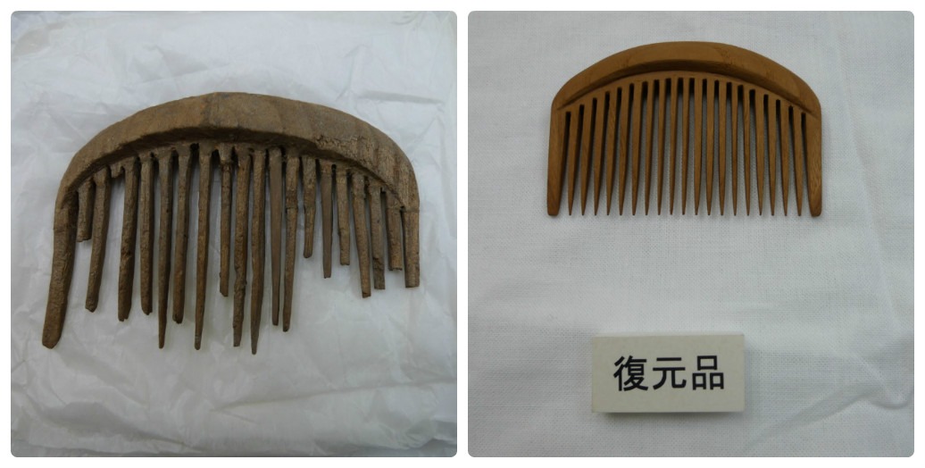 (右)「櫛留商店」森信吾氏は安城市埋蔵文化センターから依頼され最古櫛の復元品を2点製作し納めている。安城市歴史博物館 安城市埋蔵文化財センター 所蔵 撮影者小林厚子2018年6月12日