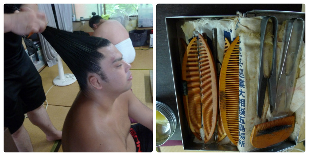 • (図5)床山(床明氏)は「今では櫛留の櫛でないと大銀杏は結えない」と話す。相撲界の床山に使われているつげ櫛は、櫛留商店が一手に引き受け、日本相撲協会へ納品している。櫛留商店のつげ櫛を使用している相撲部屋(峰崎部屋)の床山(床明氏)は、「使い込むほど飴色になり手に馴染んでくる」と述べている。 峰崎部屋にて 撮影者 小林厚子 2018 年7月2日
