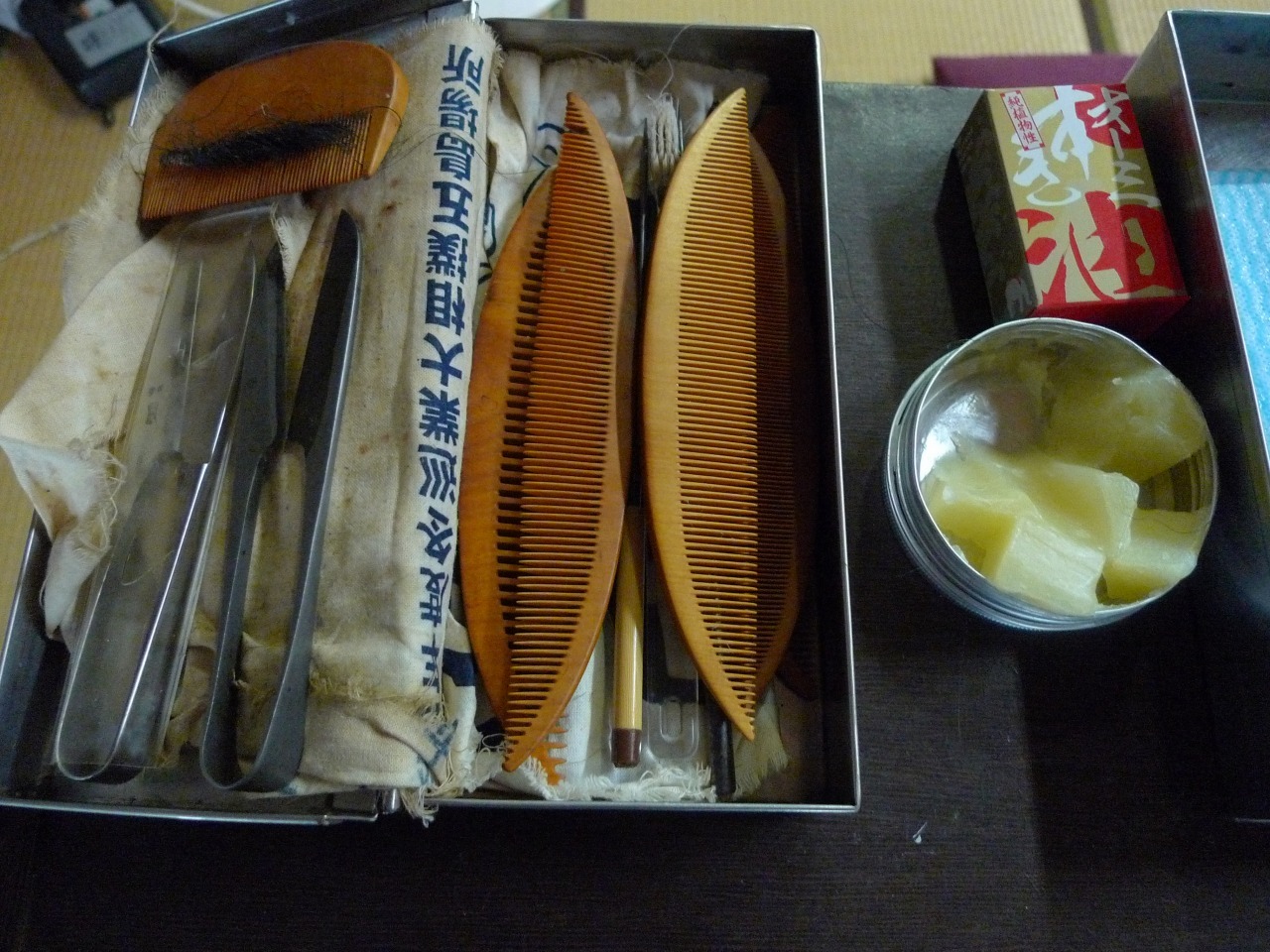 • (図8)(左)床山(床明氏)の作業箱とびんつけ油。 年1度日本相撲協会から支給される櫛留商店のつげの櫛。これは、使い込まれることで、つげの櫛が手に馴染み黄褐色から飴色になり新品よりもより美しい芸術作品である。撮影者 小林厚子 峰崎部屋にて 2018年7月2日