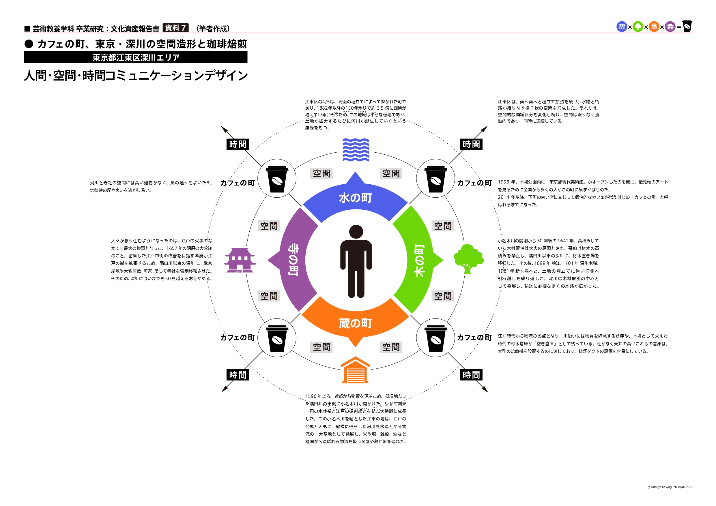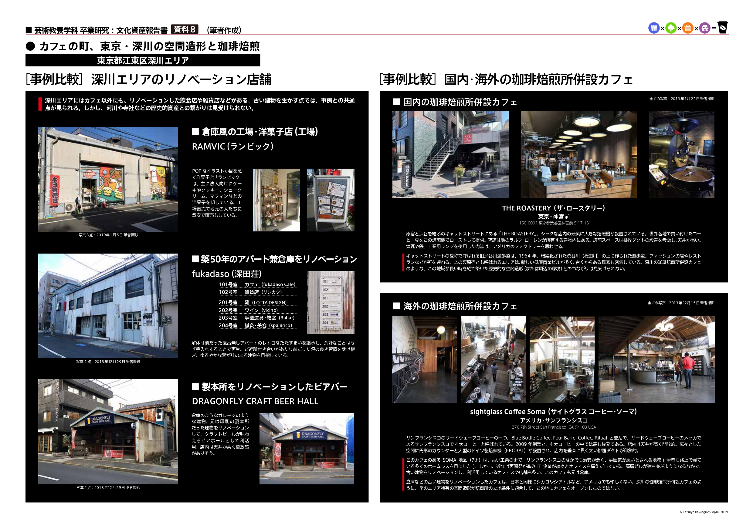 江戸時代、深川に移転してきた寺社や役目を終えたはずの材木運搬用の河川や倉庫など、空間を構成する歴史的資産が、巡り巡って珈琲焙煎所を併設する現代のカフェの立地条件に適合したことで、新しい文化と古くからある文化が融合して、地域に新たな活気をもたらしている。これはリノベーション事例の枠を越えた、人間・空間・時間のコミュニケーション事例として特筆すべきことである。【資料7】