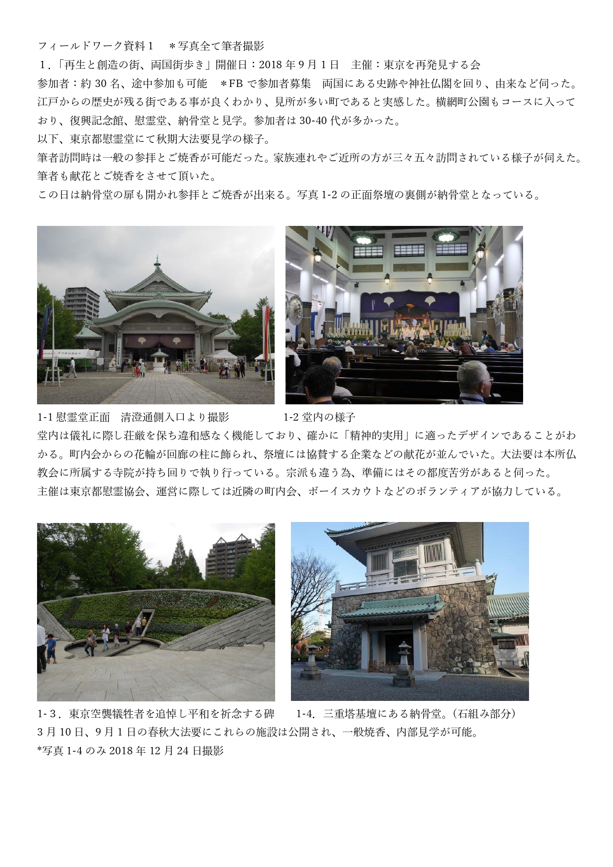 横網町公園は悲劇の現場であるが、同時に近代から現代へ激動の時代を記憶し記録している場所でもある。残念ながらその事実を知る人は、長年東京に住んでいても少ないのではないか。江戸から続く首都として、復興と再生を繰り返した歴史を記憶として留める努力が必要と考える。今後は関東大震災100周年に向けた情報発信、現存する伊東忠太設計の建造物の価値を踏まえ、近現代史、文化芸術などの教育分野、社会人対象のフィールドワーク*36など、生涯学習の場としても積極的な施設活用を提案したい。過去を知り未来を考える上で横網町公園と東京都慰霊堂は歴史的価値があり貴重な文化資産である事を報告する。