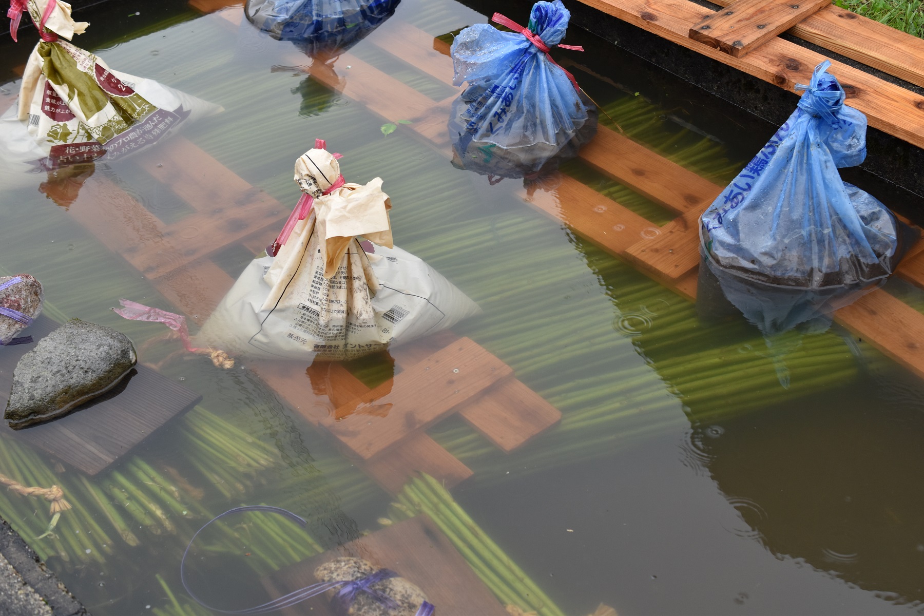 刈り取り選別したからむしは、皮を剥ぎやすくするため、一晩程山から流れる清水に浸す。[写真5]