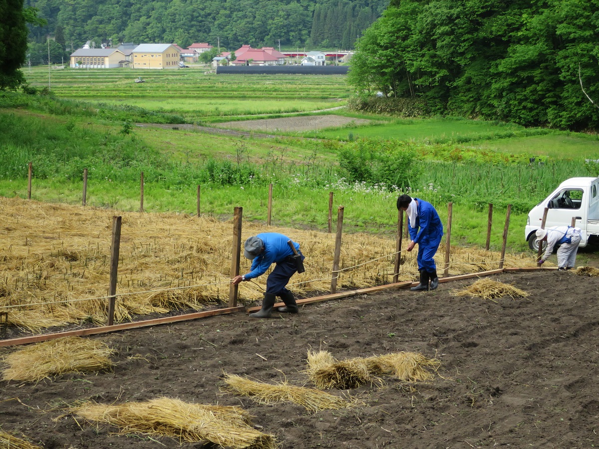 焼いた後水をまき翌日に施肥をしてから周囲に杭を立て棒カヤの垣根を作り獣の侵入を防ぎ、倒れ、擦れ合いを防止する。[写真3]
