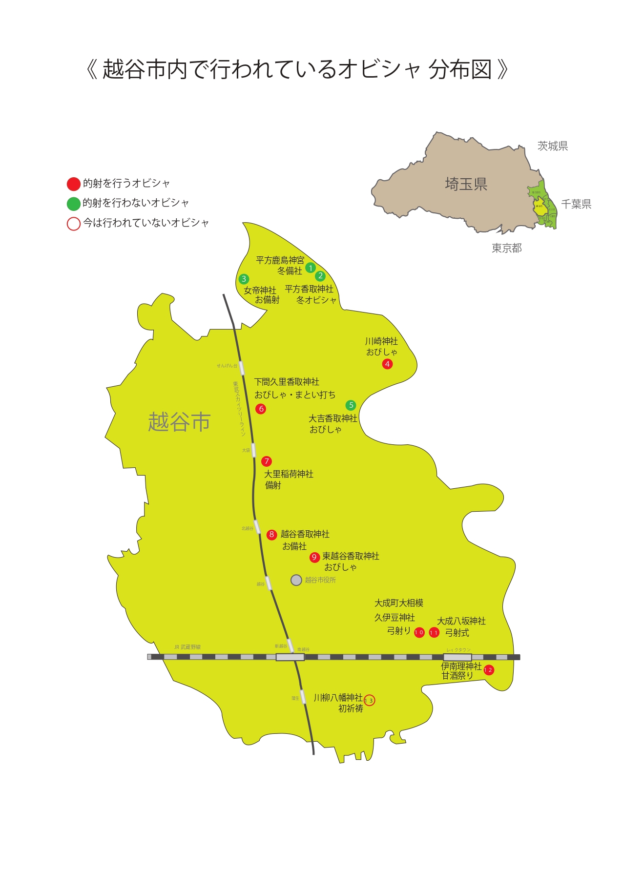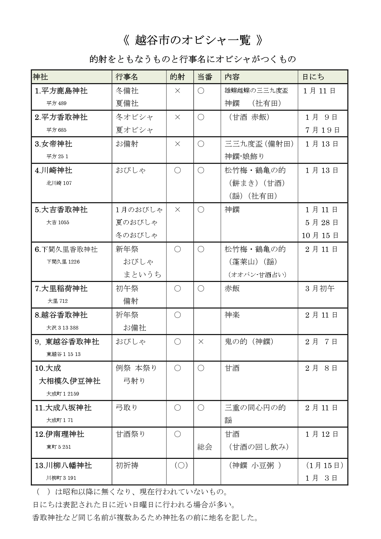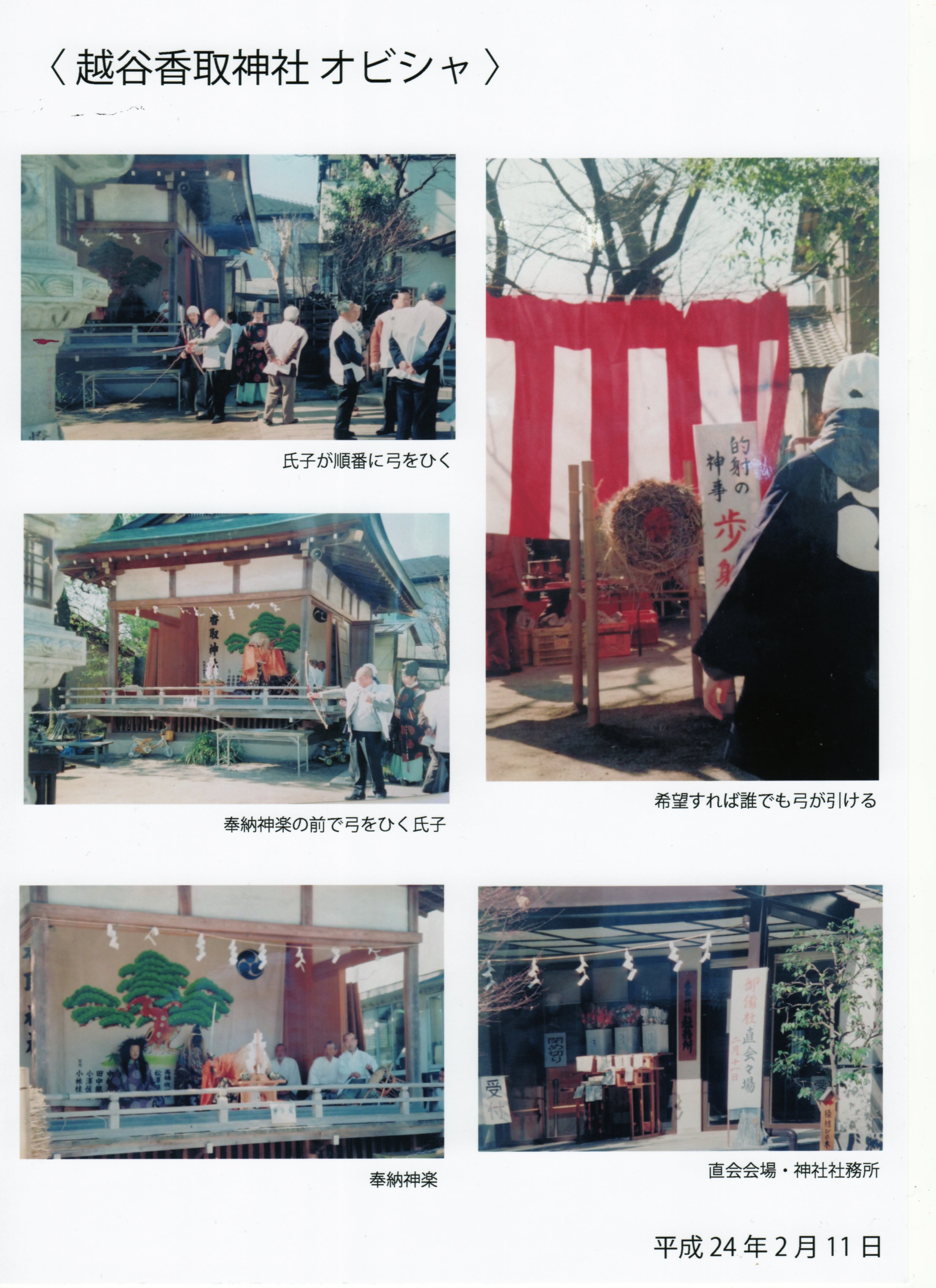 越谷市は埼玉県の南東部で千葉県に近く利根川支流の古利根川や中川が市内を流れ、的射や「オトウ渡し」の内容が豊富な「オビシャ」が行われている。