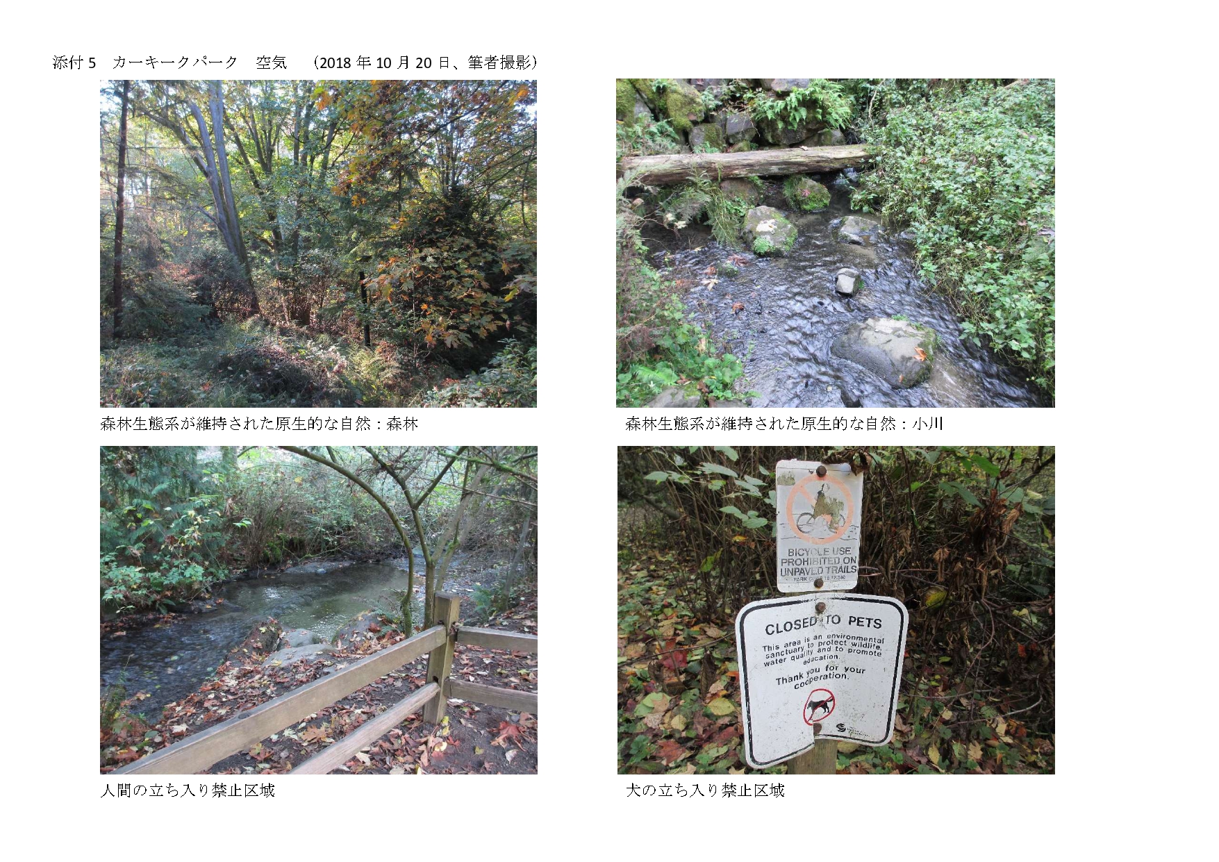 その理由の1つは、園内の空気の違いだ。カーキークパークでは、ヴィクトリアパークとは桁違いの空気の新鮮さを感じた。園内に森林を有するために、ヴィクトリアパークよりも植物の大気浄化能力が高いのだ。また、犬や人間の立ち入り禁止区域作成などを行い、森林生態系の維持に努めており、原生的な自然を保持する優れた森林管理のデザインが成されている。(註11, 12、添付5)一方、ヴィクトリアパークは、森林ではなく人工的な並木のため、カーキークパークよりも植物の大気浄化能力が低く、空気は劣る。(添付4)