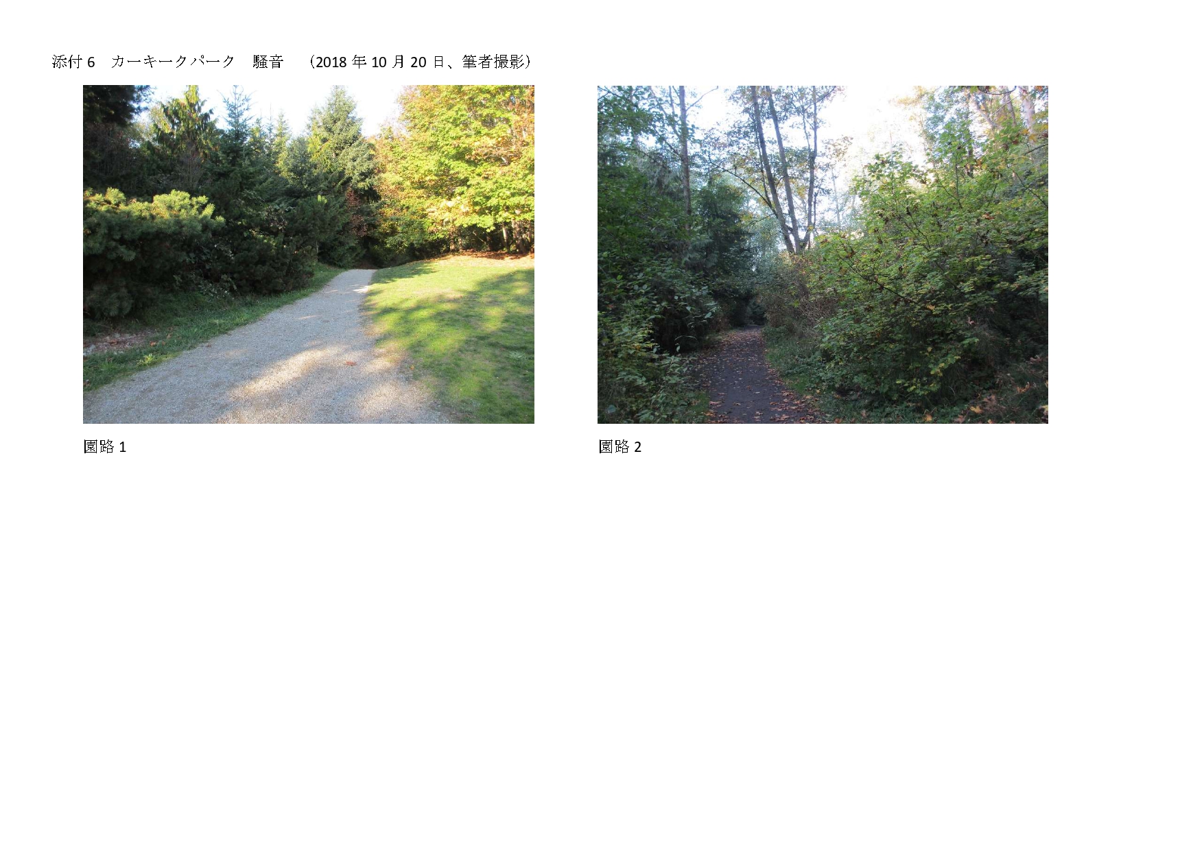 もう1つは、園内で感じる騒音の違いだ。カーキークパークの園路は樹木で囲まれ、車道に面する部分がほとんどなく、全く騒音を感じなかった。車道と園路の間に森林を設置することで、森林の防音機能(註13)を利用している優れたデザインの園路だ。(添付3, 6)一方、ヴィクトリアパークでは、運河に面する西と南では騒音を感じなかったが、車道に面する北と東や、東西の公園間の車道近くでは、園内にいても車の騒音を感じた。(添付2, 7)