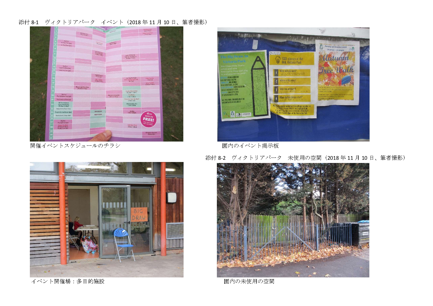 ヴィクトリアパークでは、描画や図工、ゲーム、公園の野生動物・木の生態などを学べる多様な無料イベントが毎月開催されており、貧富の差に関わらずに参加できる、優れた交流の場のデザインである。(註14、添付8-1)だが、「イベントの存在を知らなかった」という地域住民が多く、認知不足でその役割はまだ果たせていないと考える。また、イベントは単発または不定期開催のため、日常的に交流できる機能は有していない。