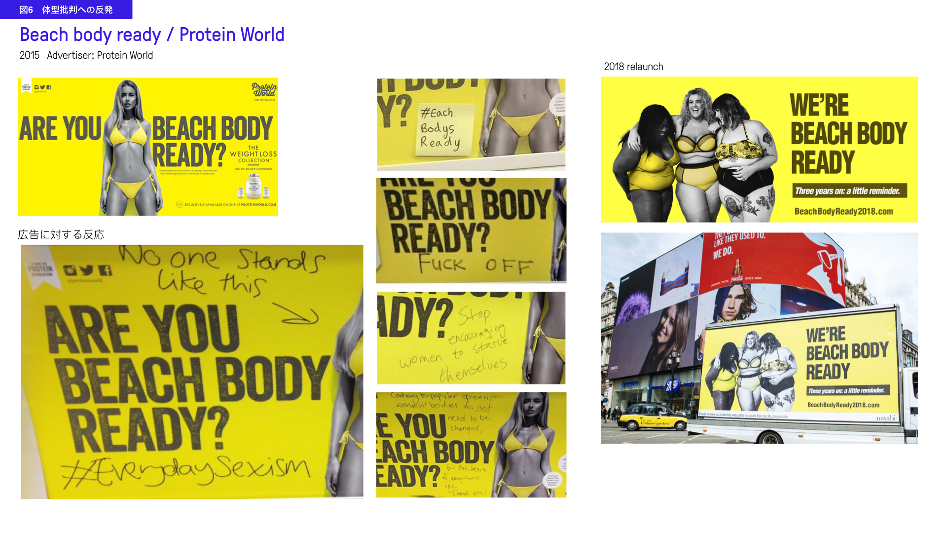 水着姿の女性の横に「ビーチに行く準備はできてる?」と問いかける地下鉄広告は、通勤者から直書きでの批判を受けた。非現実的な身体基準を押し付けているという意見が寄せられ、広告はまもなく取り下げられた。同社は3年後に同じキャッチコピーで、女性たちが肩を組んで笑い合っている広告を「正しくない体型など存在しない」というコメントと共に発表し、好意的に受け入れられた。*10