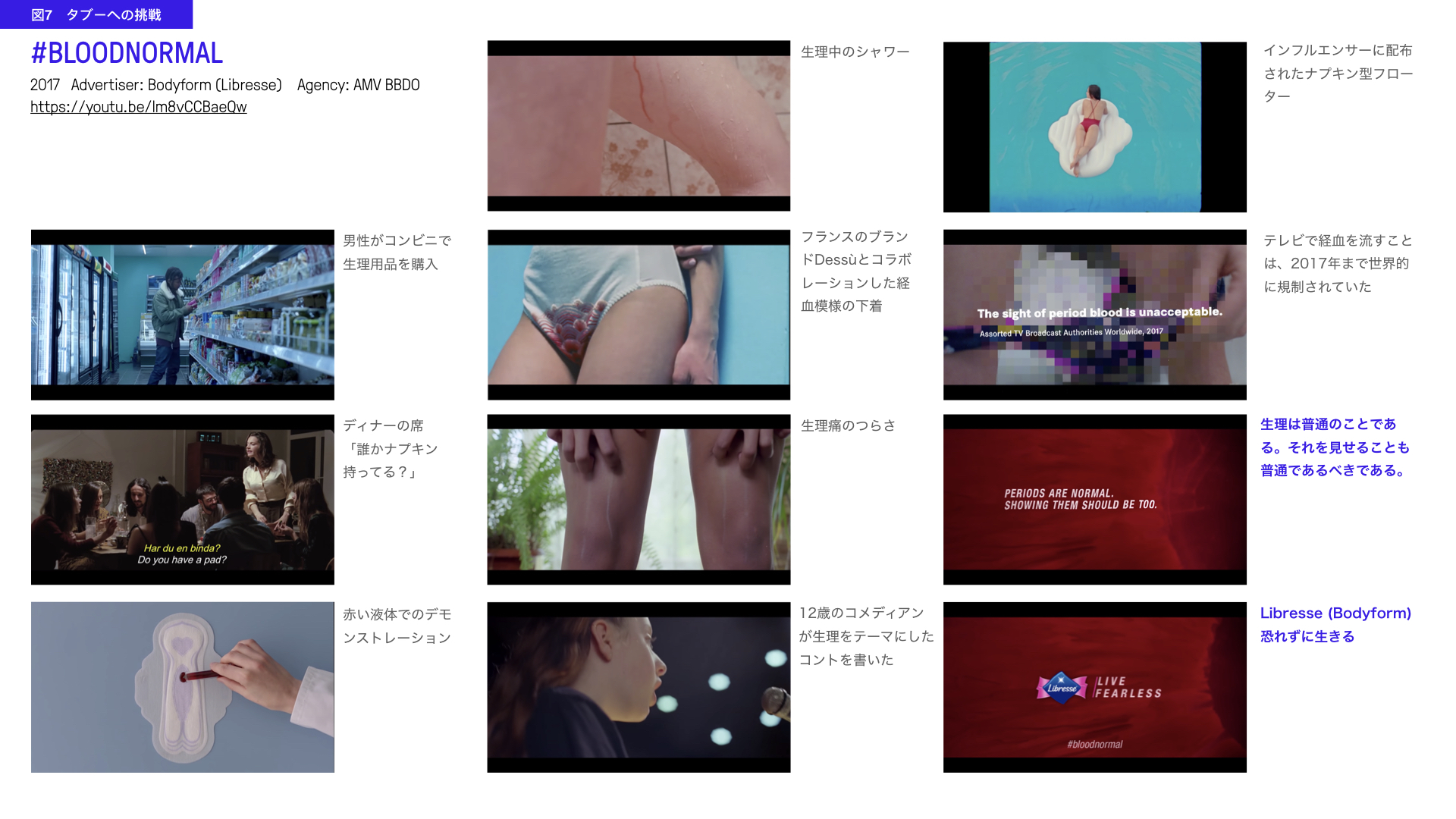 Bodyformは生理用品の広告で初めて赤い液体を使用した。2017年までTVで経血を流すことは、世界的に規制されていた。経血、生理痛や、生理中の性行為、男性が生理用品を購入する光景などで生理が当たり前であることを描写した。短編映画コンペ、12歳の女子が書いた生理コント、ナプキン型フローターなどがメディアに露出し「共感は恥ずかしさを凌ぐ」というコメントが寄せられた。