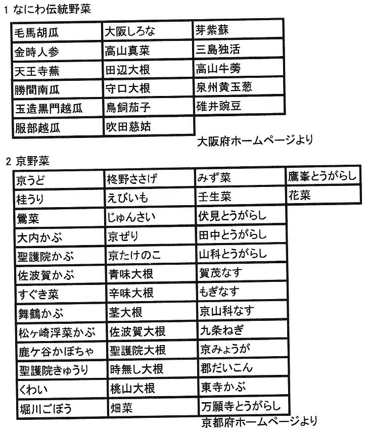 また、大阪京都どちらの伝統野菜も、元々は違う品種が栽培されており、それらの取って代わるように江戸時代あたりから栽培されるようになった。現在は、伝統野菜が新しい品種に代わられて、栽培量が減少したものや一時期栽培されなくなったものもある。再度栽培されるようになったものの、調理時間がかかってしまうことや、収穫量が少なく値段が高いなど問題もあり姿を消したものを再度流通量は増加するとは難しい。