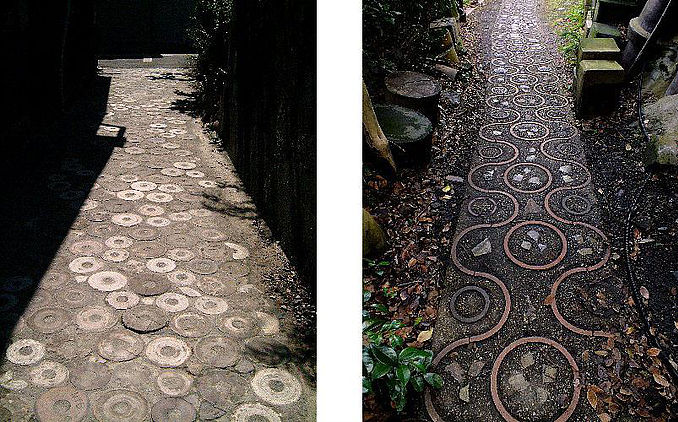 パターン化して埋められた土管の通路。 作った人の遊び心とアート感覚が伺われる。 -