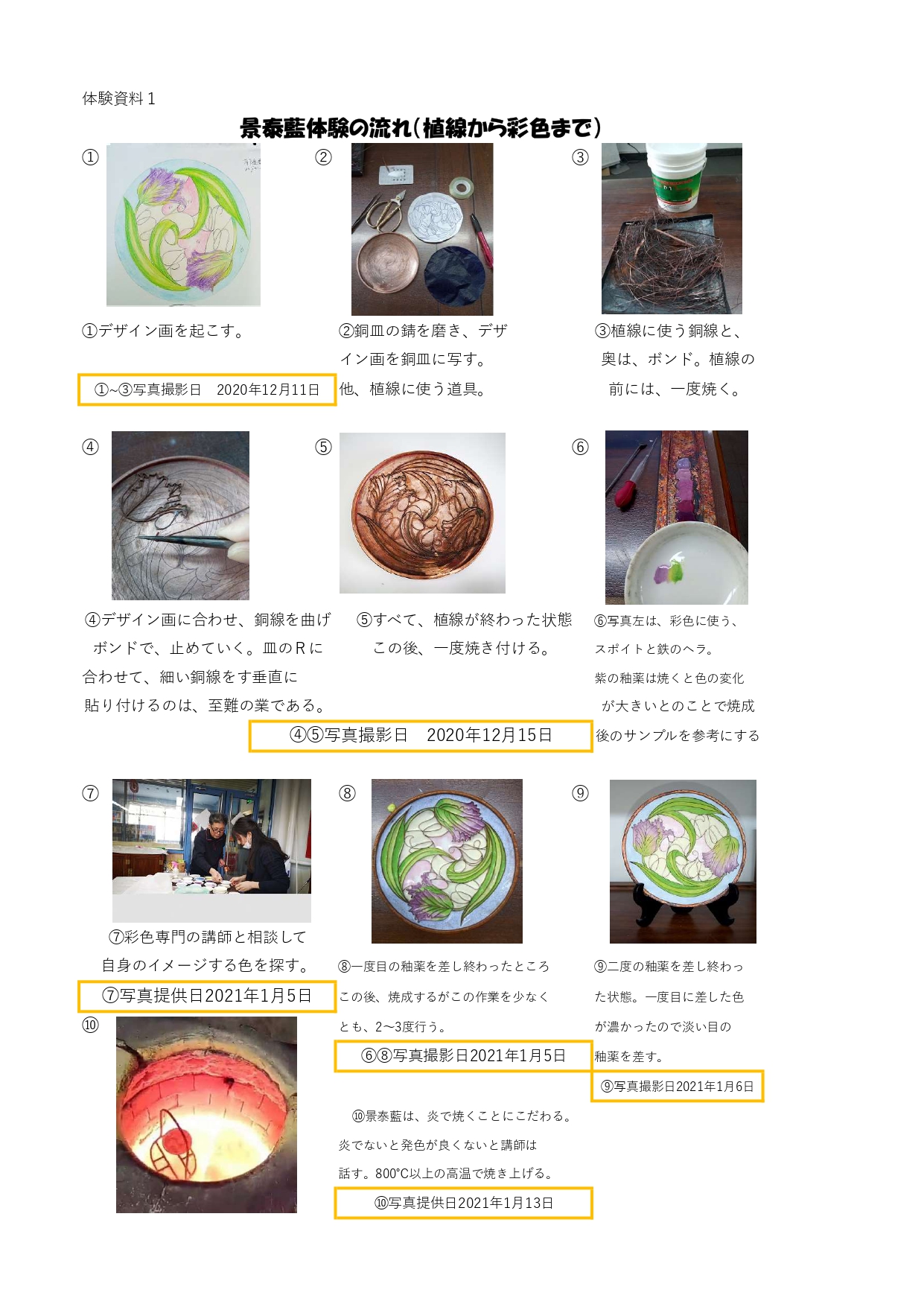 また、様々なオリジナルにも相談すれば対応してくれるそうだ[9]。琺瑯廠は国営企業であるにもかかわらず、柔軟な対応ができる点も特筆すべきだろう。筆者は、後日銅皿にデザインから植線まで行う体験もし、その工程を資料として別紙にまとめた[別紙資料]。