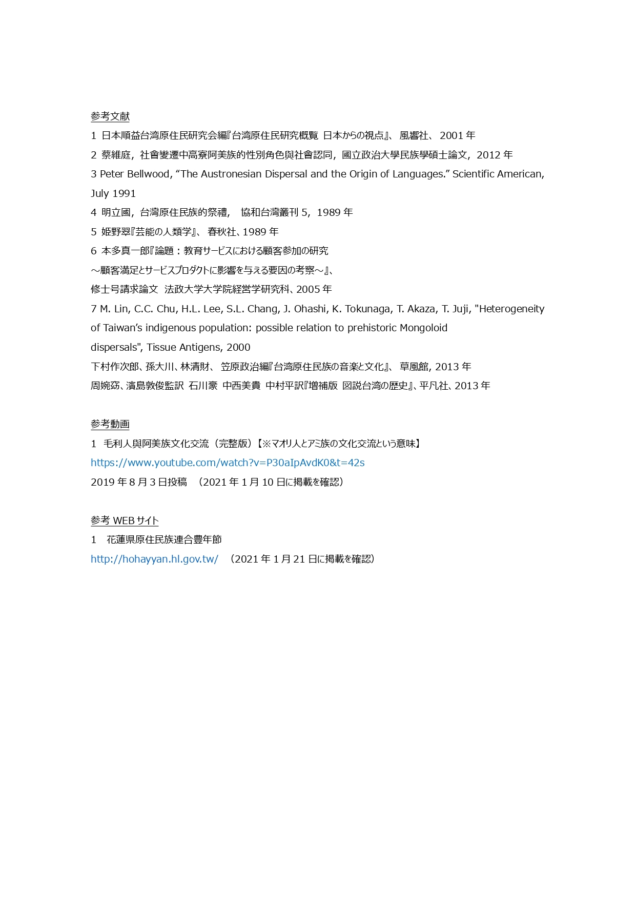 台湾には大陸渡来の漢民族の他に、古来より台湾に住んでいた原住民族が存在している。現在16種族、約54万人が生活している。今回調査したのは、台湾花蓮県吉安郷南宜昌村(娜荳蘭【読み:ナタオラン】部落)に住むアミ族という原住民族の豊年祭という伝統行事(儀式)についてである。この活動を詳らかにしていくことで、原住民文化とその意義を理解し、同行事を評価する。また、行事に対しての個人的見解を加え、文化資産報告とする。