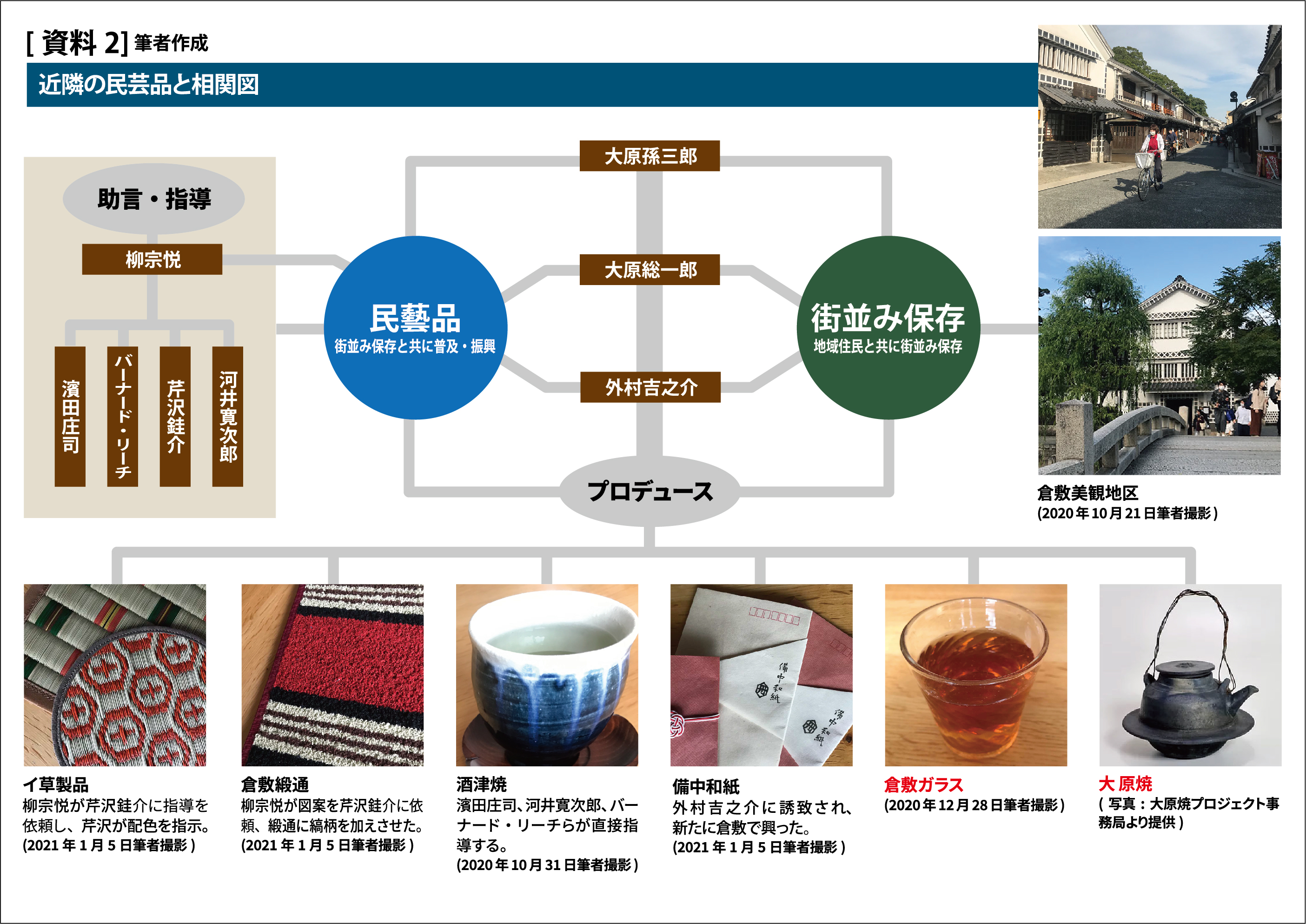 美観地区の中核にある大原美術館を開設した大原孫三郎[6]と息子の総一郎[7]は倉敷の芸術振興の他、街並み保存や「民芸」[8]にも深い関心を寄せた。酒津焼の復興から[9]、柳宗悦[10]らと知り合い、大原孫三郎による建設費寄贈により1936年、東京に日本民藝館が開設された。