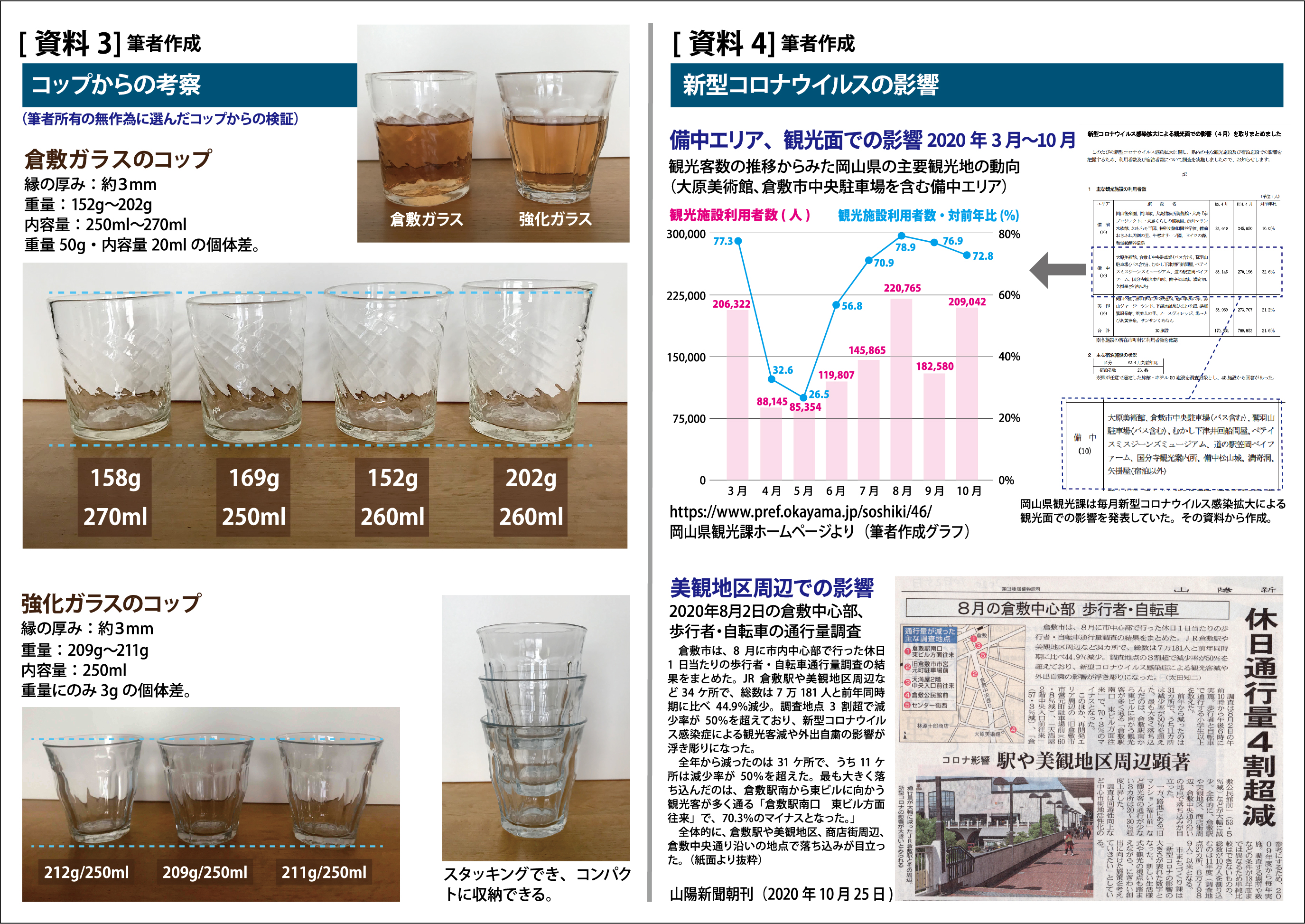 一方で、倉敷ガラスのコップには個体差があり微妙に表情が異なる[資料3]。また、安価とは言えず、耐熱性やスタッキング機能はない。そして手荒に扱うと壊れる。これらは単純に評価はできない。