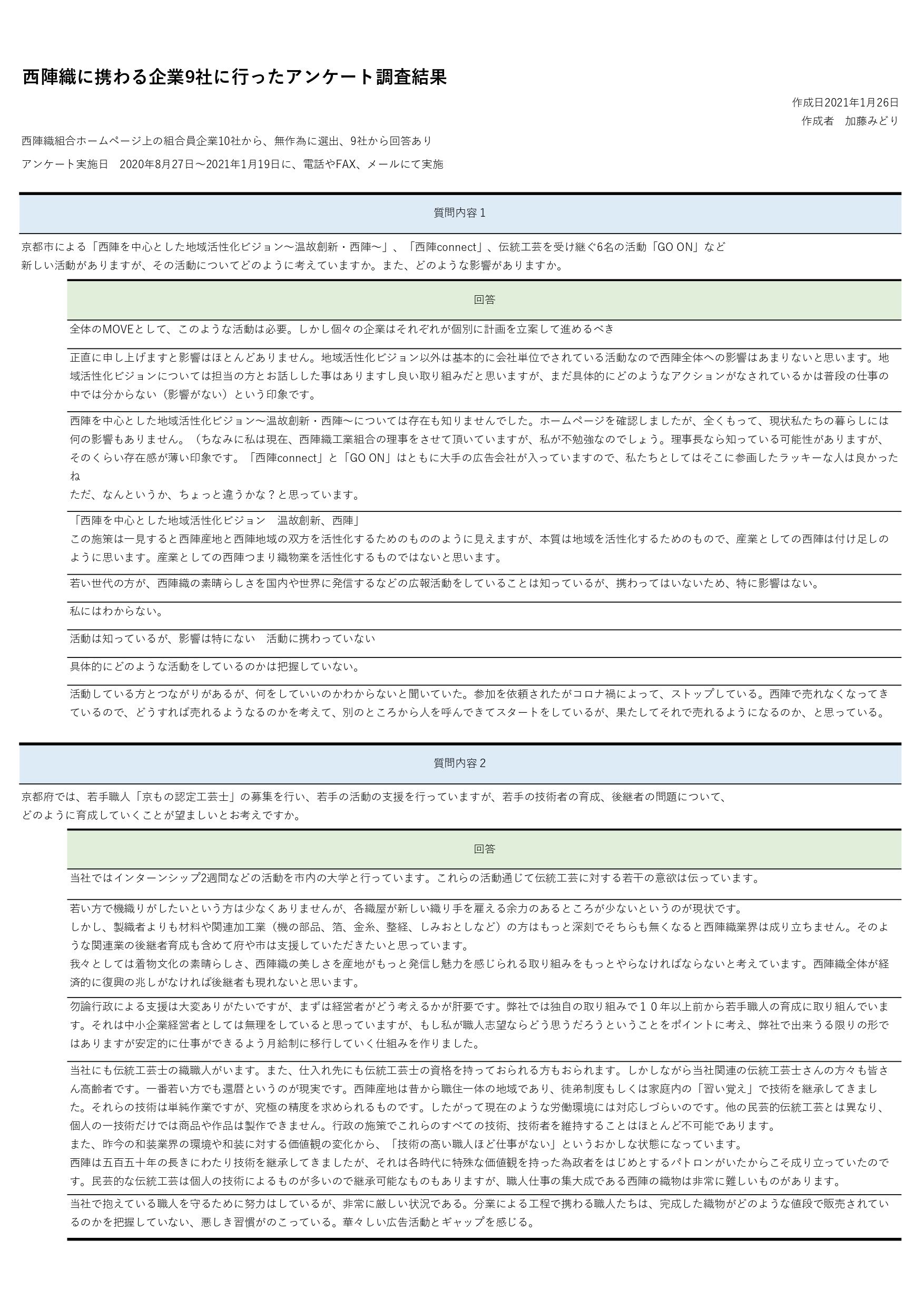 西陣織企業アンケート結果は、西陣織組合ホームページ上の組合員企業10社から、無作為にアンケートを実施し、その内の9社から回答結果を筆者がまとめ、2021年1月26日に筆者が作成した。
