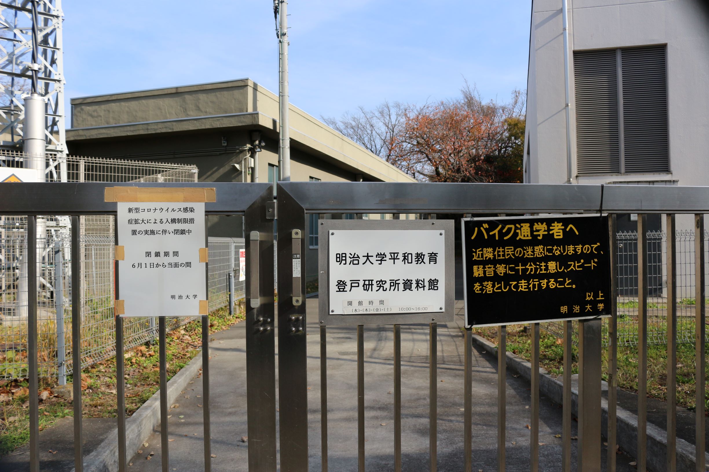 コロナ禍のため閉館中。(明治大学生田キャンパス西南門の外より、2020年12月13日、筆者撮影) -