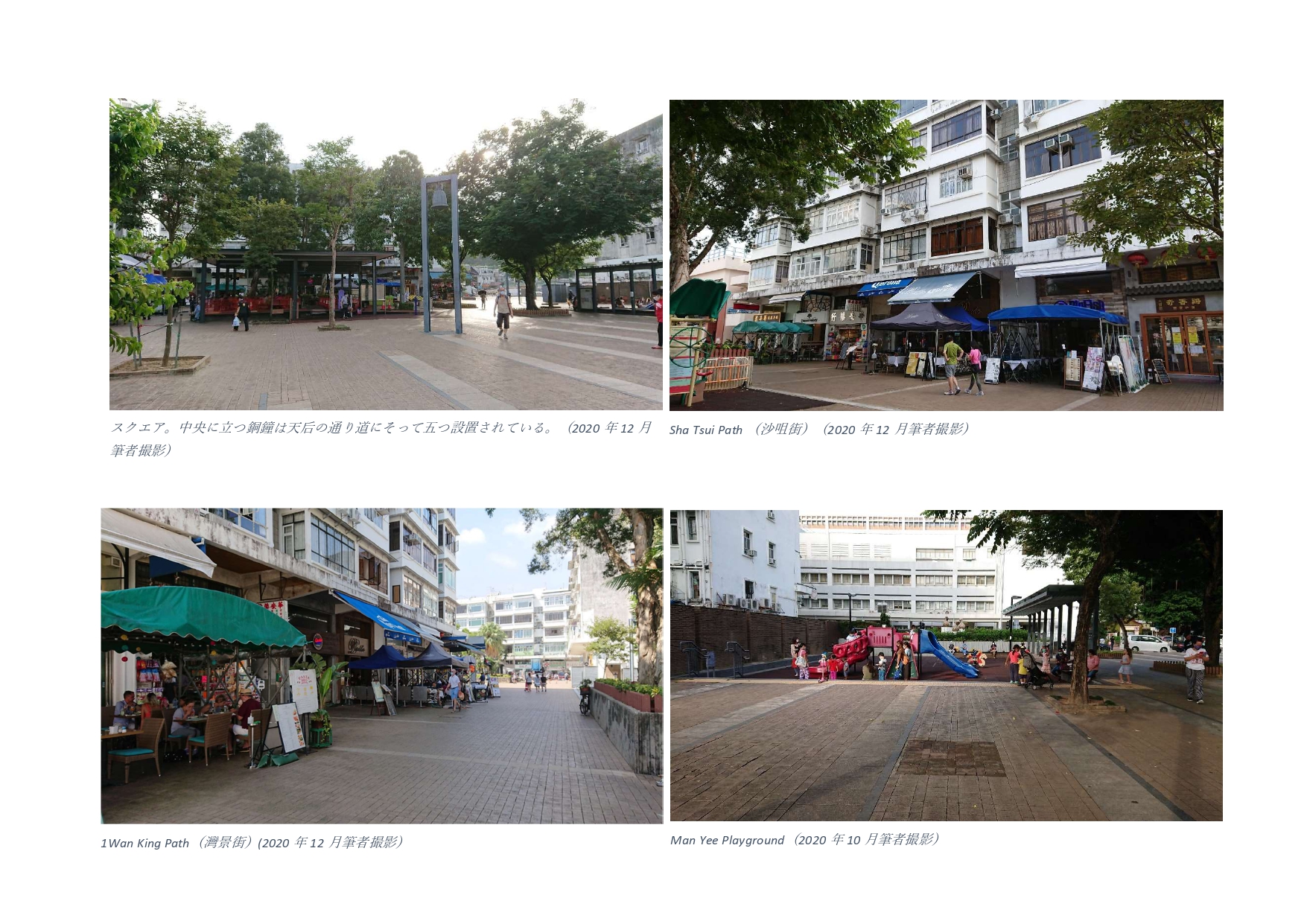 Man Yee Playground (萬宜遊楽場)、Wan King Path(湾景街) とSha Tsui Path(沙咀街)の三つの空間から成る通称 「西貢スクエア」(以下「スクエア」)がそれである。天后の通り道にあるスクエアは三方を五階建ての住居ビルが囲み、一階にはレストランやパン屋などの店が並ぶ。子供達が遊び場で遊び、ベンチで老人達が佇み、人々がレストランやカフェで食事やお茶を楽しんだり買い物で通過するといった、スクエアの日常風景は生活感と開放感がある。スクエアを中心軸にすると、その周辺は山、天后古廟、オールドタウン、海鮮料理街、海、公共スポーツ施設などが囲み、様々な商店が点在する。また、天后古廟前の広場では天后フェスティバルの際に仮設されたバンブーシアター ㉗で広東オペラ㉘が行われ、春節にはスクエアの近くでフラワーマーケットが仮設されるなど、スクエア周辺では伝統行事に関わる催しが見られる。「西貢スクエア」は通称であり、広場としての公式な名称がないことから、町を利用する人々が意図せずとも必然的に作り出した「中心性」のある空間だ。つまり、コミュニティが創出した広場であり、言い換えれば、中心であるスクエアの主役はコミュニティである。