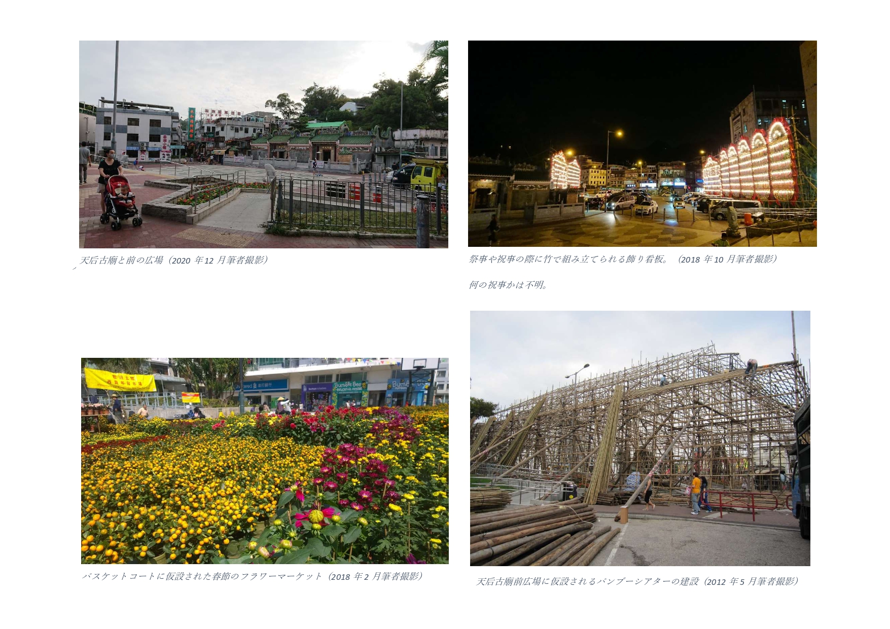 1960年代の埋立以降、元来海辺に位置していた天后を祀る天后古廟⑮は内陸に位置する。埋立地の住居ビル建設にあたり、風水⑯が考慮され、海の女神である天后の海への通り道が確保された。そのために、天后古廟と埠頭を結んだ直線上には天后古廟前の広場、バスケットコート、西貢スクエア、沙咀プレーグランド、ミニバスターミナルがあり、建物の障害物は一切ない〔添付2〕。つまり、風水と天后を尊重する香港人の信仰がインプットされた履歴のデザイン空間であり、その空間が解放感をもたらしている。