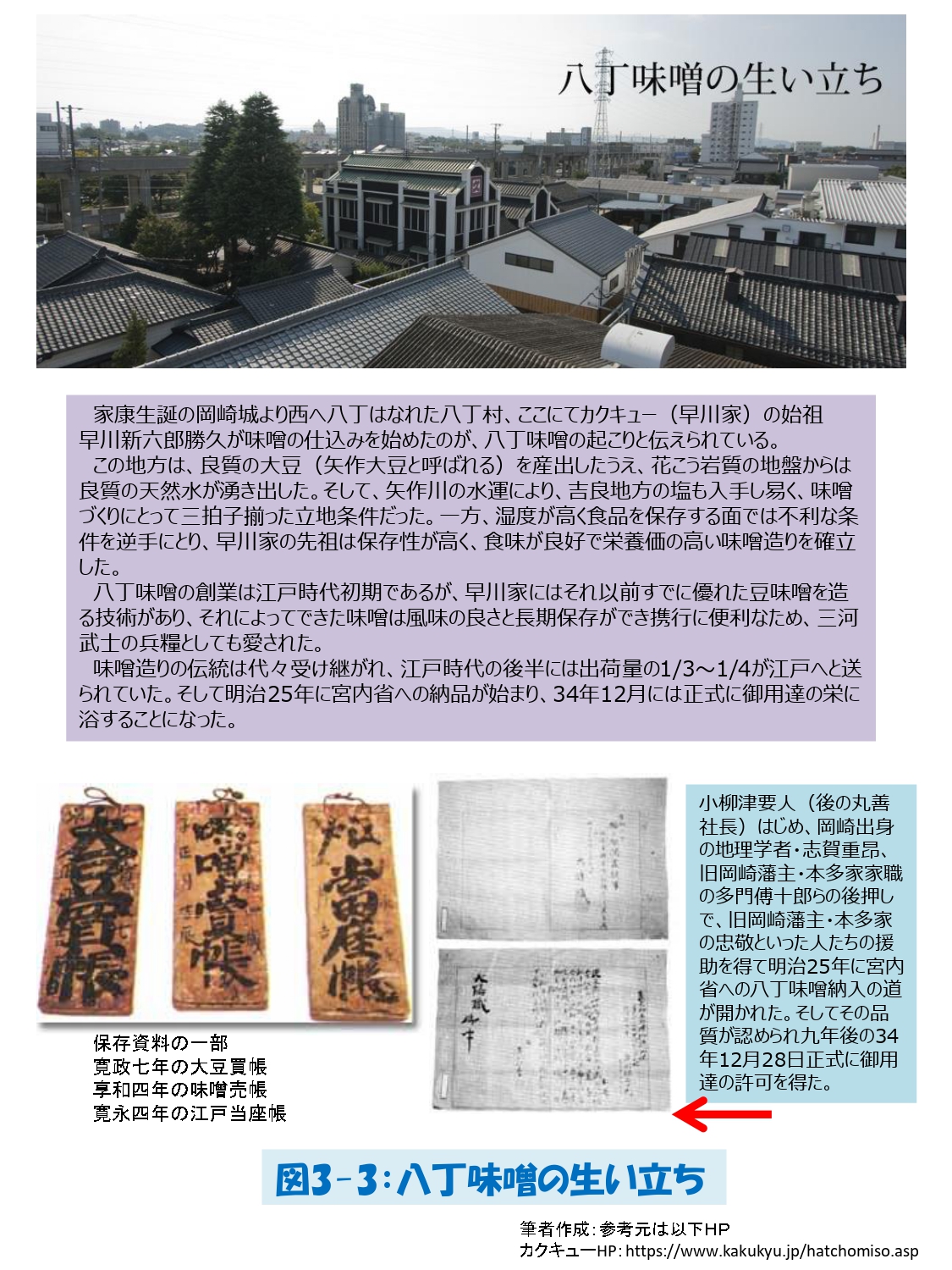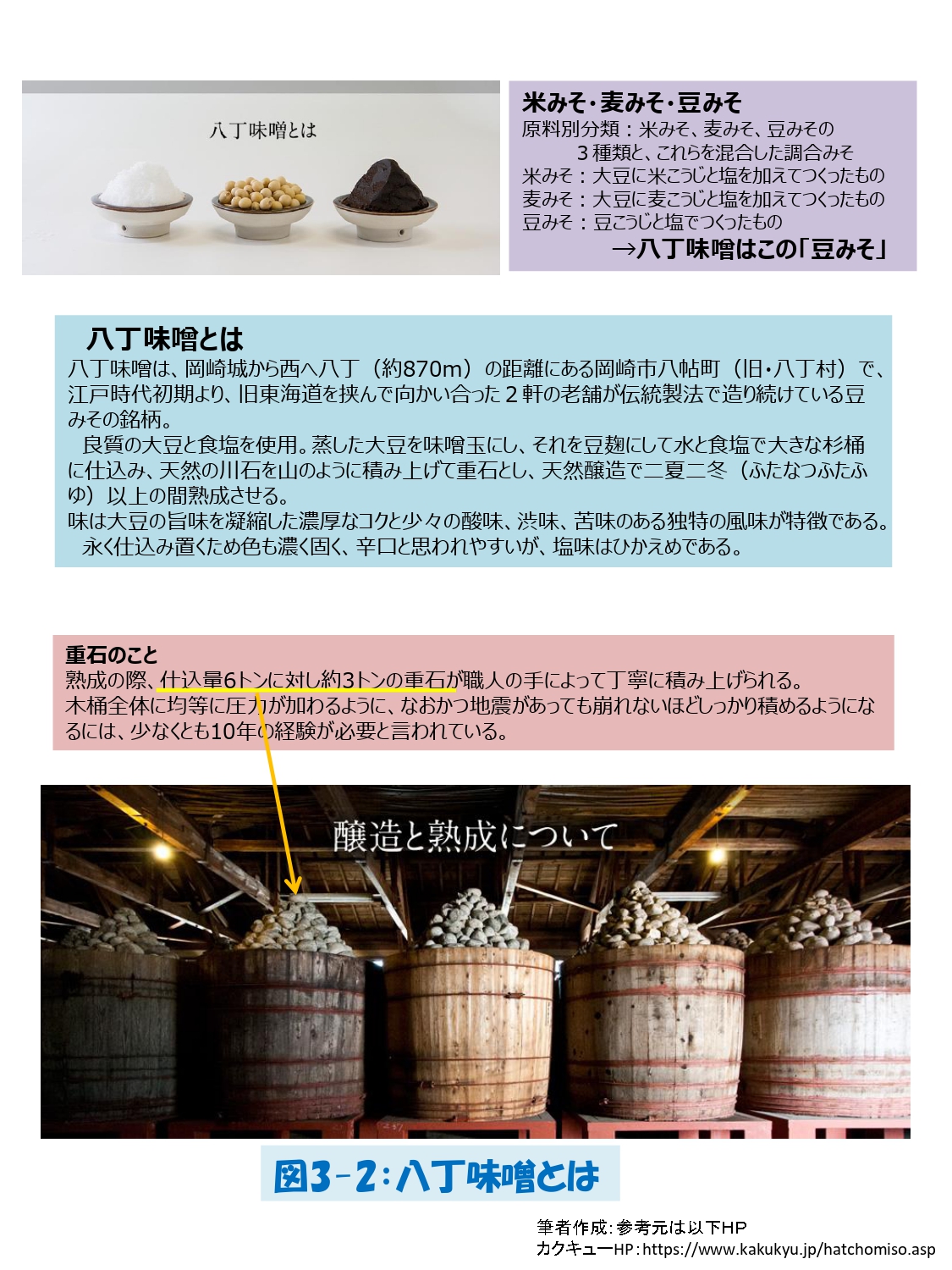 味噌には「米味噌」「麦味噌」「豆味噌」があり(図3-2)、八丁味噌は豆味噌である。味噌の由来には大陸渡来説や日本発生説等あるが、豆味噌だけは、大陸からの渡来だとされる(註2)。三河の地は大豆栽培が盛んであり、吉良地方の塩田があったため、味噌製造が根付いた。戦国時代には、徳川家康が戦闘食として愛用した。すなわち、岡崎の地には1337年に「まるや」1560年に「カクキュー」という二軒の老舗味噌業者が創業し(図3-2、3)、この二軒は切磋琢磨し現在に至る。この二軒が「岡崎城から八丁の距離」にあるため、「八丁味噌」と呼ばれるようになった。