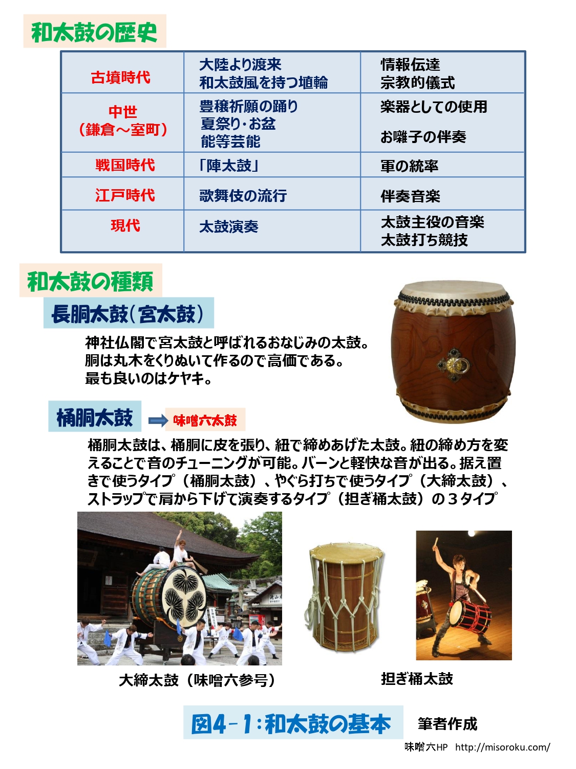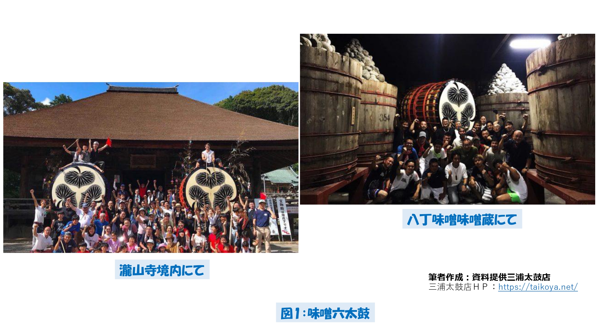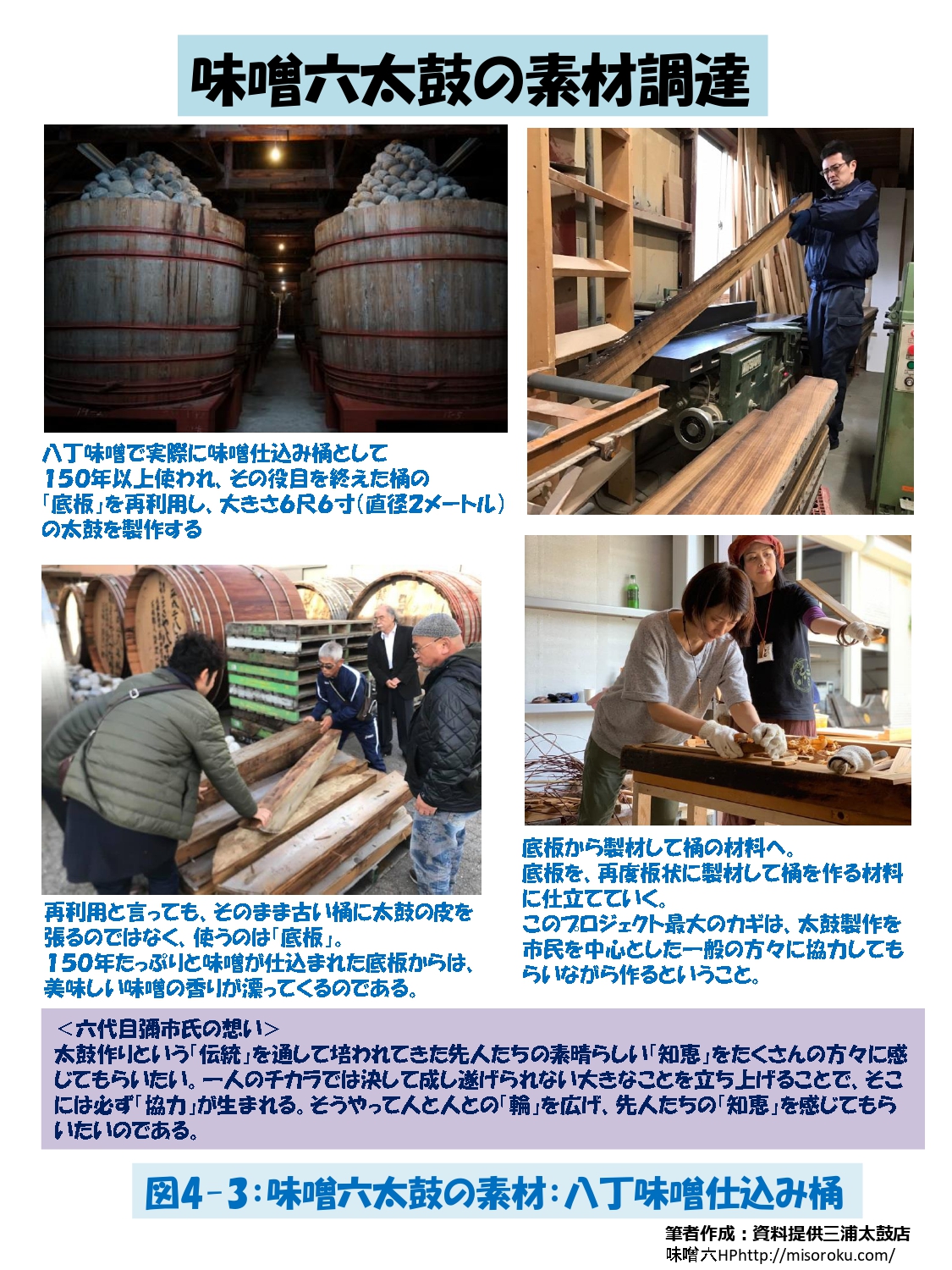 「味噌六太鼓」(図1)とは、岡崎市で製造される「八丁味噌」を仕込む木桶を用いて作られた大太鼓(桶胴太鼓)(図4-1)である。桶胴に用いられる古材は150年以上も味噌仕込みに利用された杉材であり、味噌の香りがしみこんでいる。