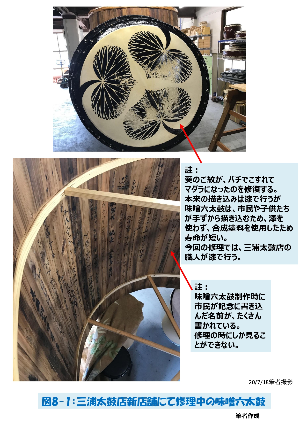 20年夏、新生移転した三浦太鼓店に、味噌六太鼓が修理に戻って来た(図8-1、2)。修理し、また祭り等のイベントへ出ていくのが活動の本筋である。