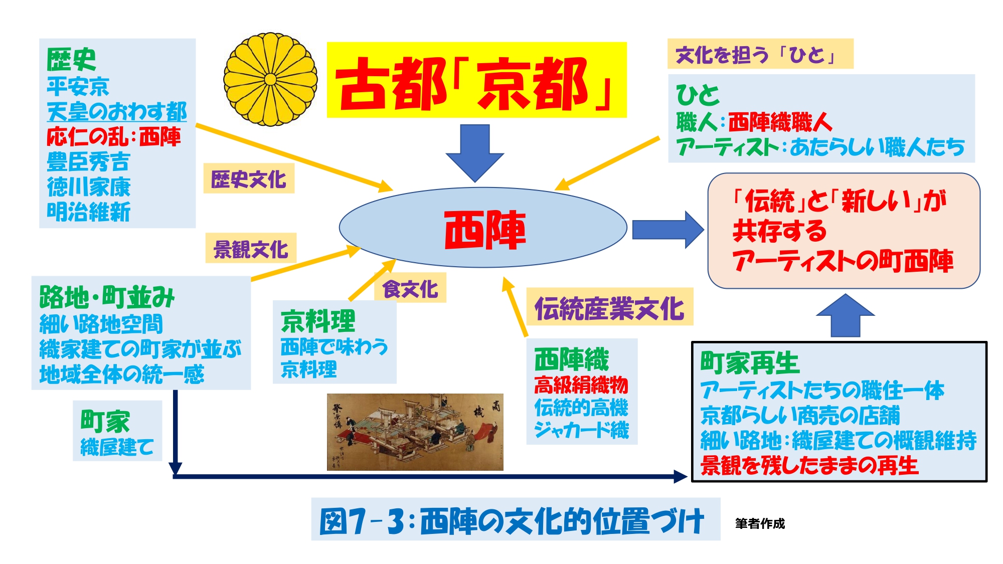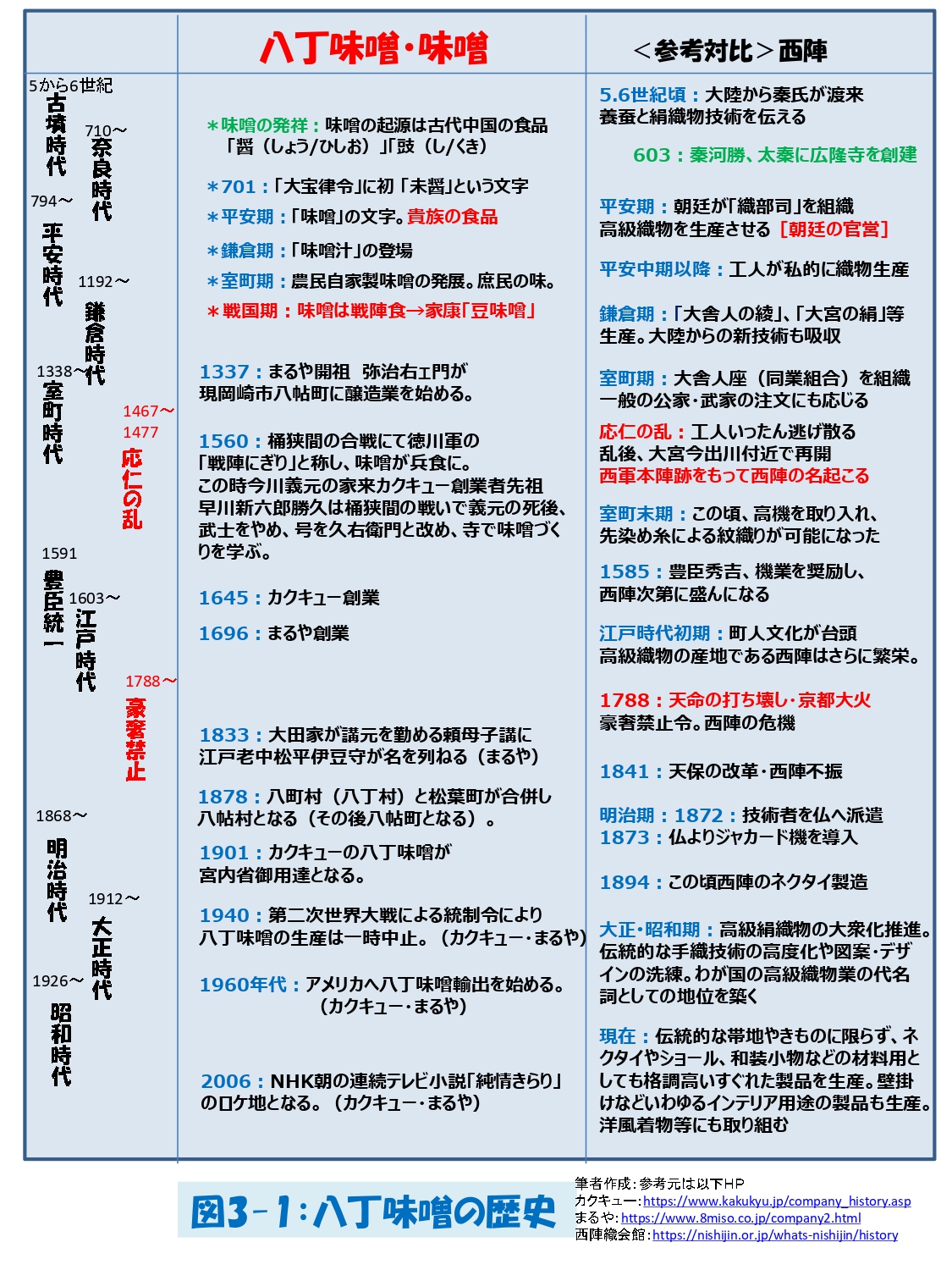 工芸品と建物という相違はあるが、双方の持つ歴史的背景や文化的位置づけは驚くほど似ている(図7-2、3)。八丁味噌も西陣織も古墳時代に大陸から伝来した古い歴史を持つ(図3-1)。かたや徳川宗家と深い関わりを持ち、かたや天皇を頂く古都の歴史を誇る。