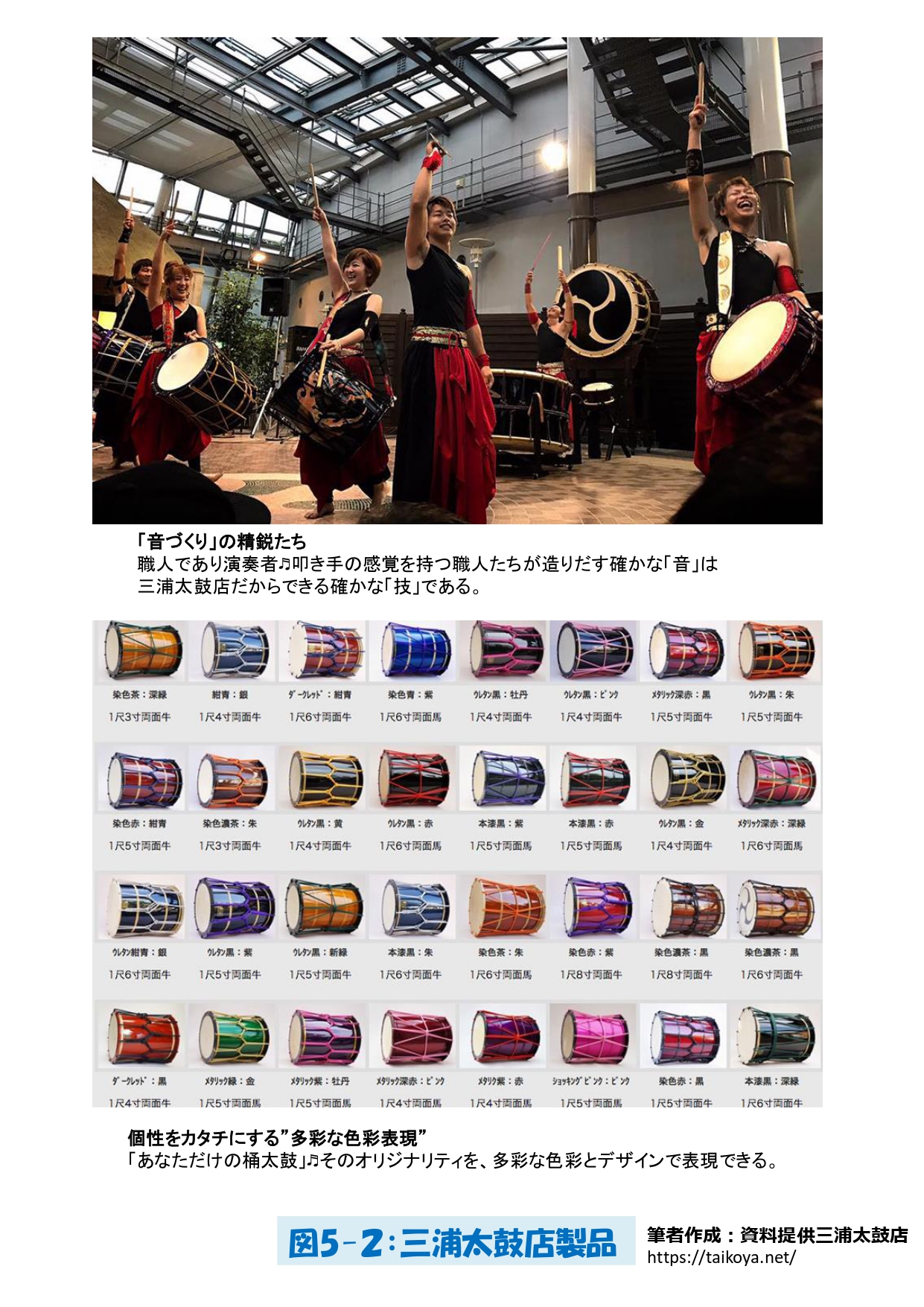 三浦太鼓店創業は慶応元年(図5-1)。明治時代は太鼓需要も多かった。主力は神社仏閣の長胴太鼓である。だが、時代とともに需要は減少し、三浦太鼓店も存亡の危機にあったが、近年、和太鼓に変化が起きた。演奏の舞台化、パーソナルユース化、IT化である。