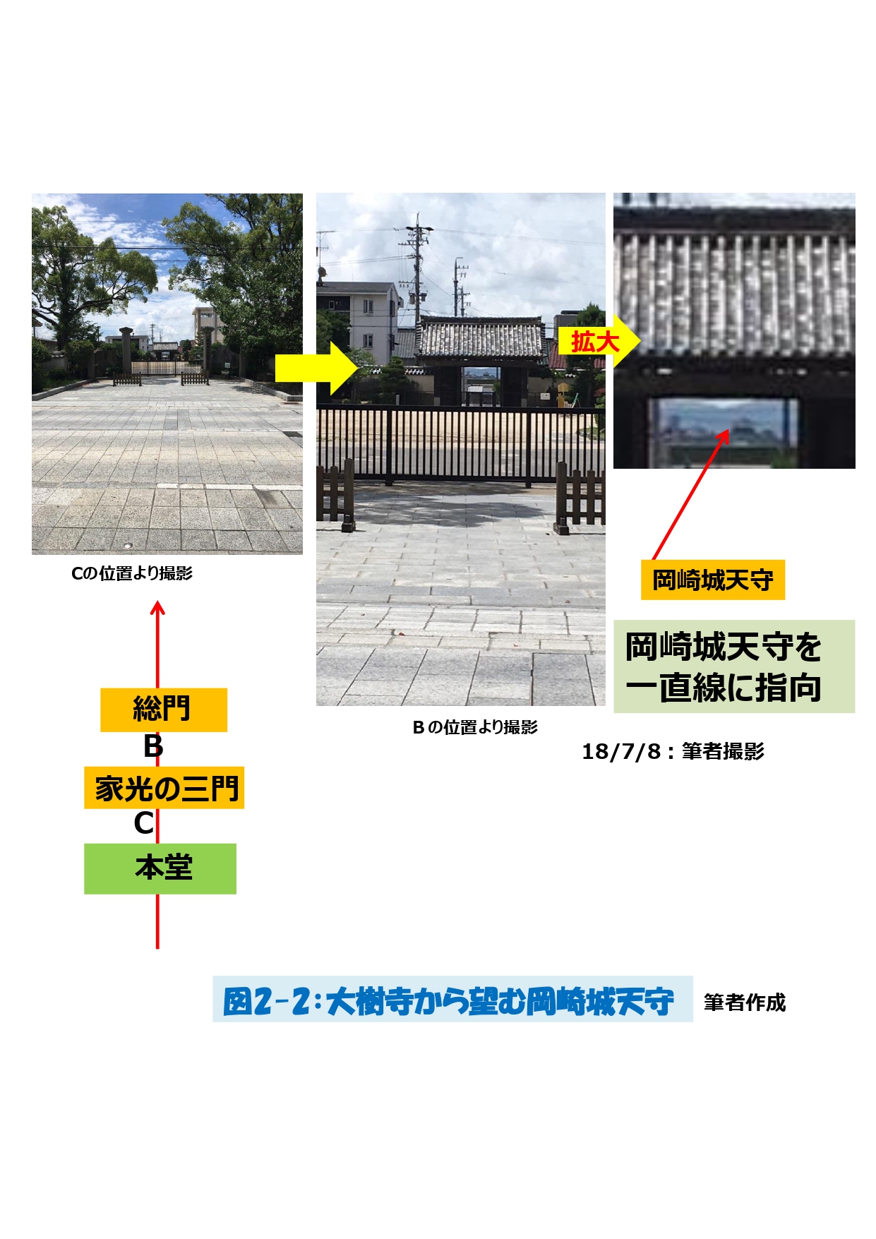 大樹寺は徳川氏の菩提寺で、家康から14代家茂までの等身大の位牌がおさめられており、3代将軍徳川家光により改築された。現在も残る家光建立の三門は、家光の指示「本堂から三門をとおし、岡崎城の天守閣が見えるようにせよ。」を守り、現在でも岡崎城天守閣が望める。この間約3km。このラインをビスタライン(図2-1、2、3)と名づけ、現在岡崎市条例によりこの眺望をさえぎる高層建築は許可されない。観光資源としての景観を保っている。