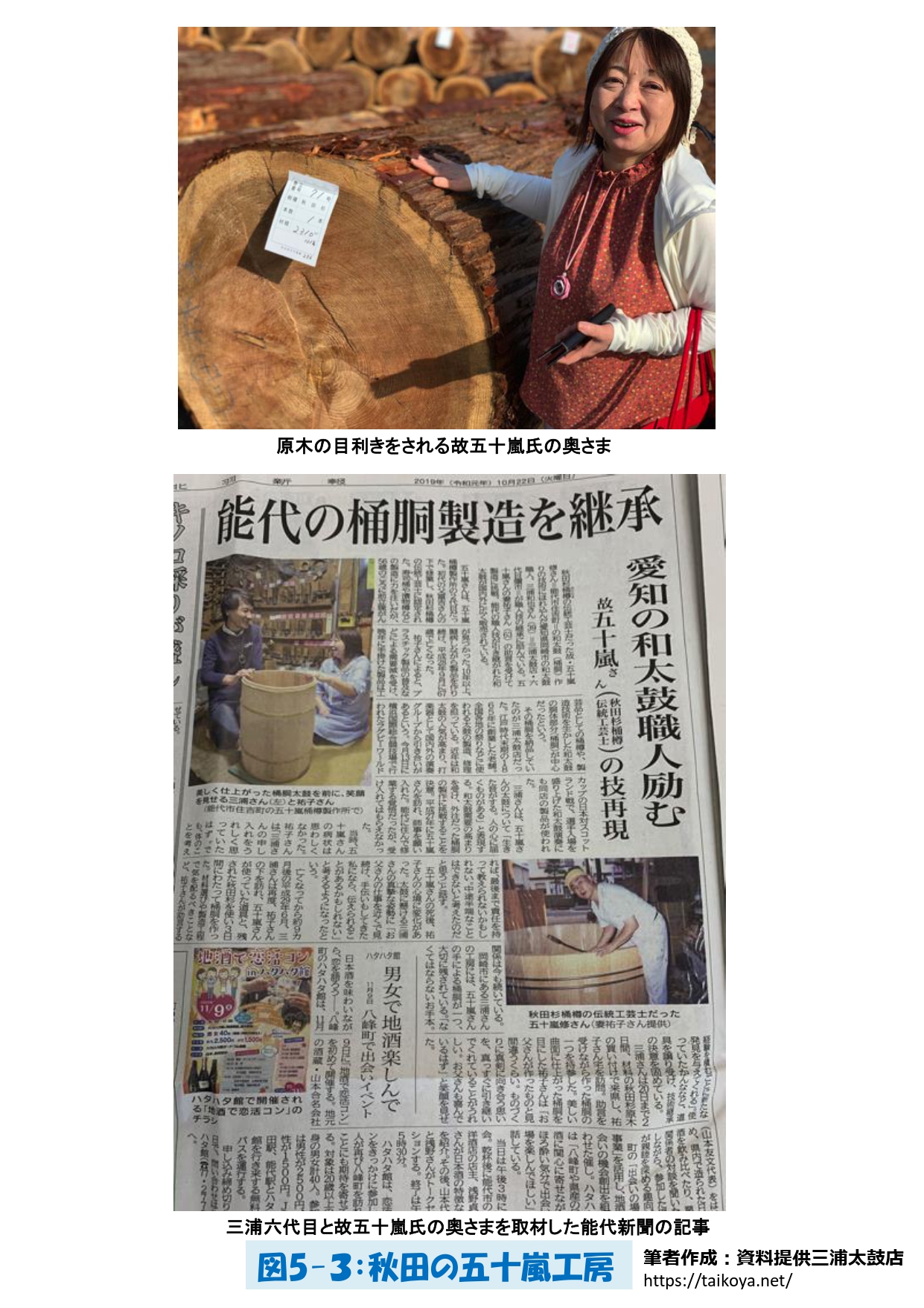 そこへ故五十嵐氏の妻祐子さんが手を差し伸べ、工房にあった道具類一式をすべて譲渡された(図5-3、4、5)。このようにして「職人魂のバトン」が引き継がれ味噌六太鼓実現につながった。