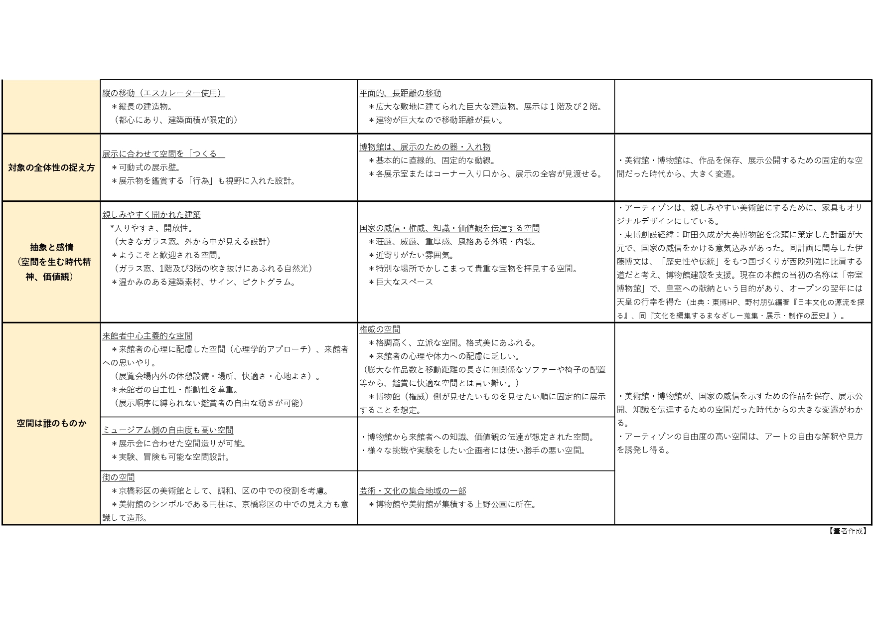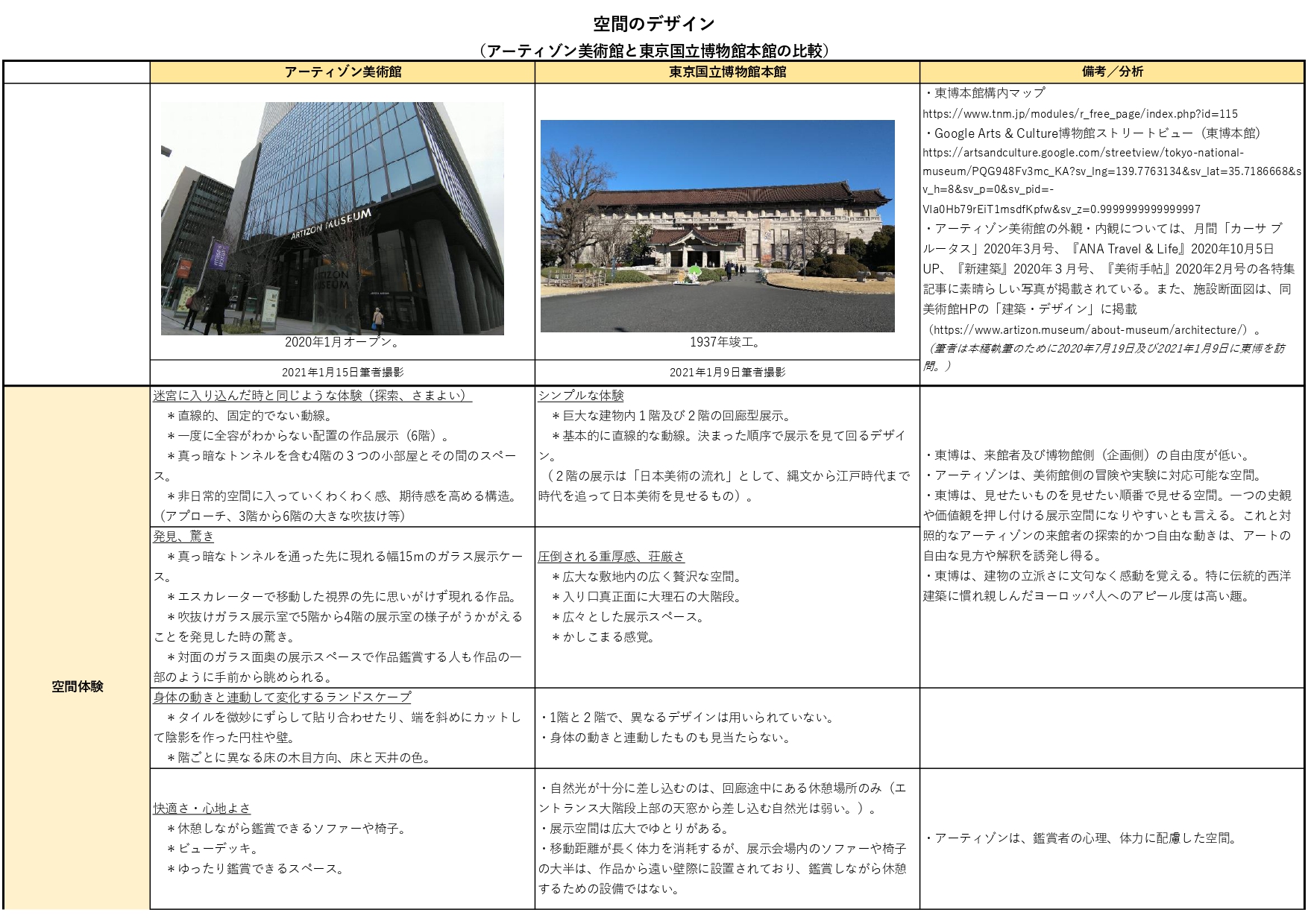 【表】空間のデザイン(アーティゾン美術館と東京国立博物館本館の比較):筆者作成 -