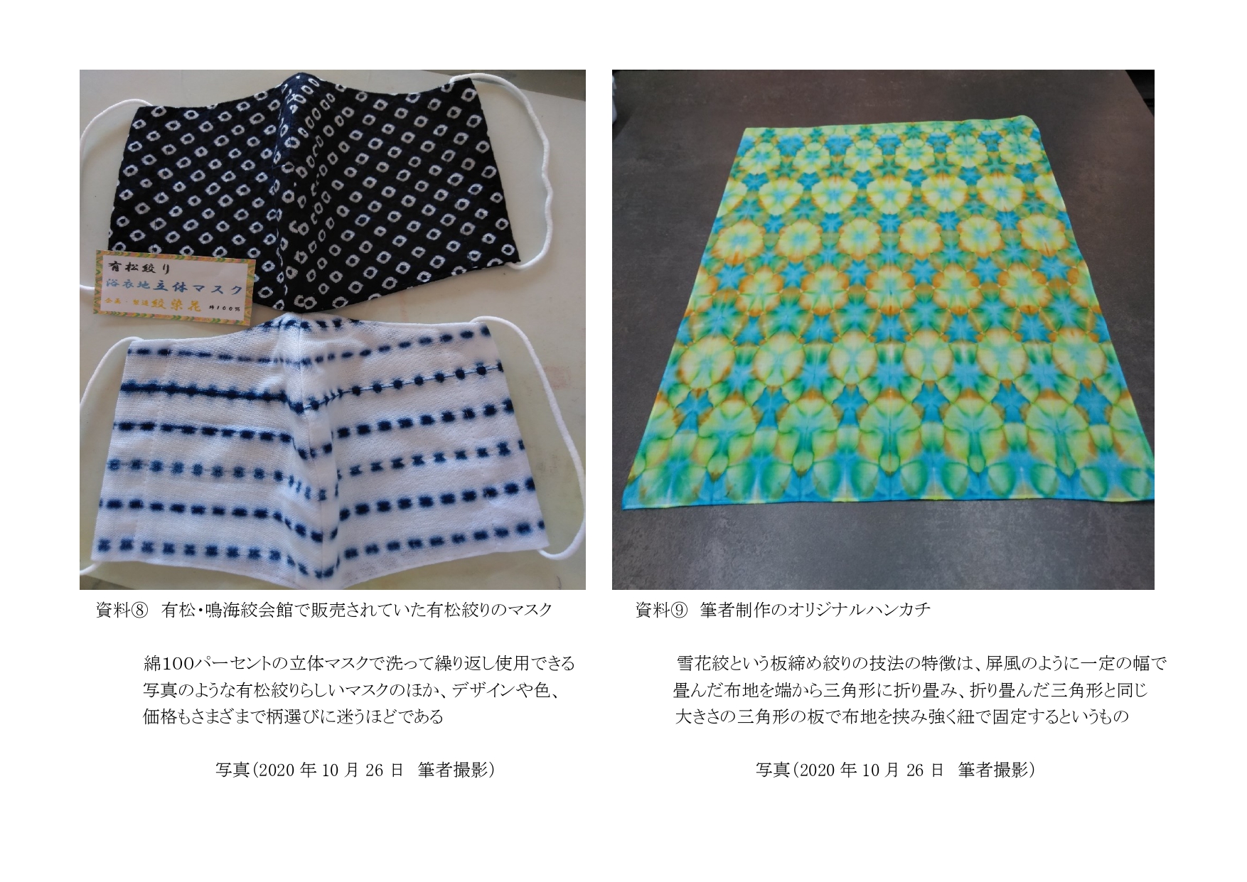 取材した日の午後に訪れた店舗でのハンカチ絞り体験は、有松絞りをより身近に感じるものとなった。挑戦した絞りの技法は雪花絞という板締め絞りの技法で、染色する時に三角形の各角や面の色を変えると華やかな表現になり、出来上がったハンカチは世界に一つだけの作品となった。(資料⑨)