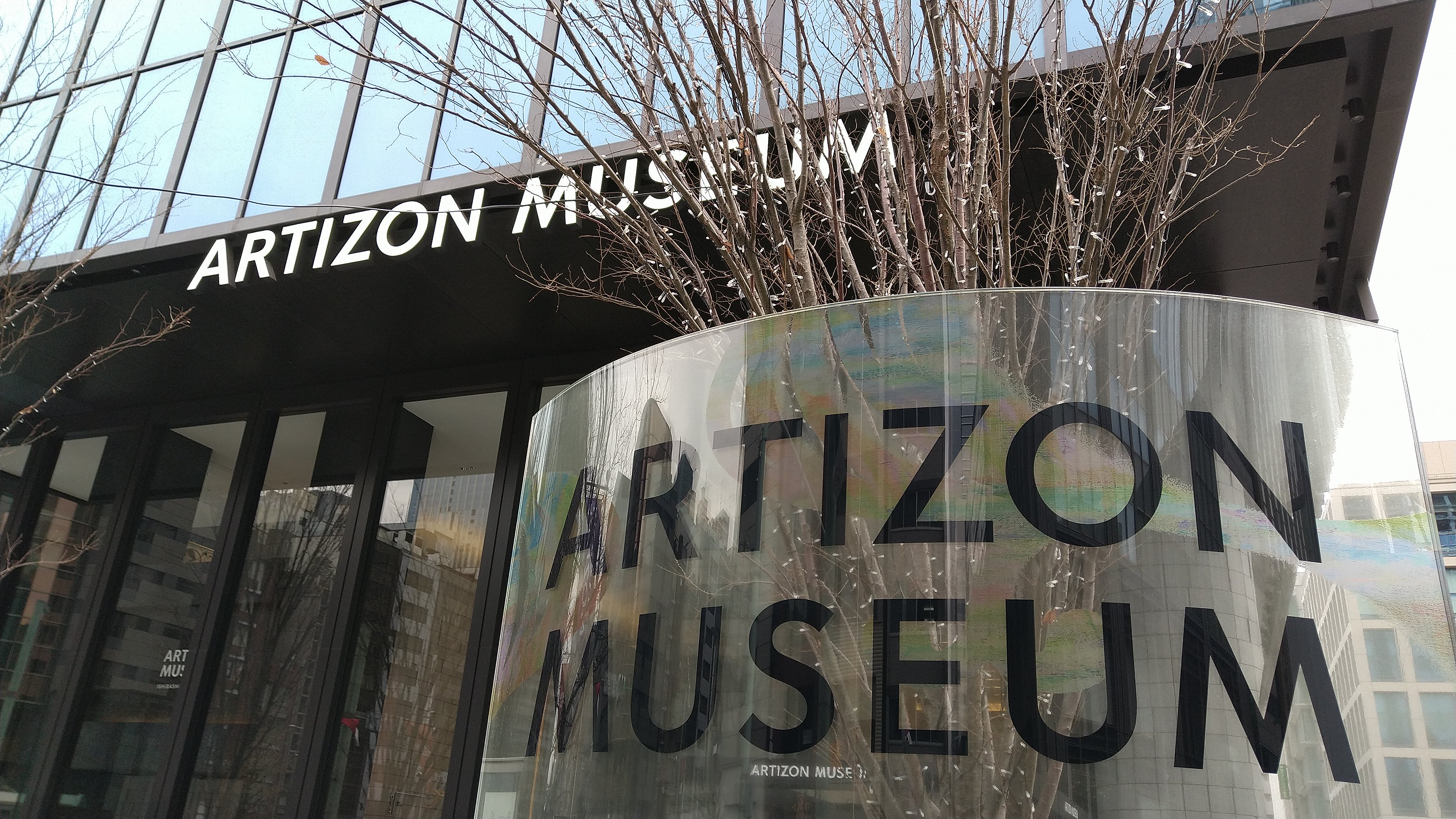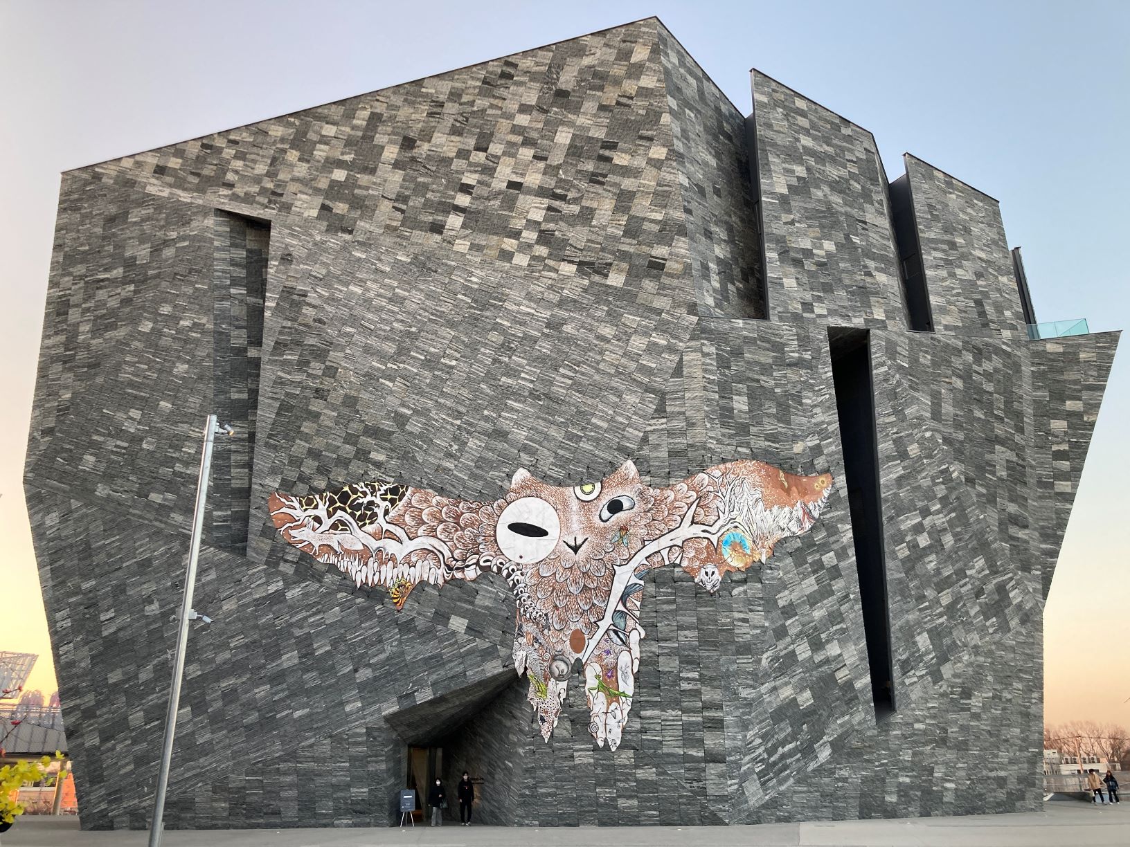 2021年1月、「岩」は新たな姿を見せてくれた。「岩」の、あの壁面に作品が展示されたのだ[写真4]。例えるならば、愛用のノートパソコンに気に入ったステッカーを貼ったような、筆者にとっては「岩」へのさらなる愛着度アップである。オープンしたての角川武蔵野ミュージアムは、まだまだこれから我々を驚かせてくれるのだ。