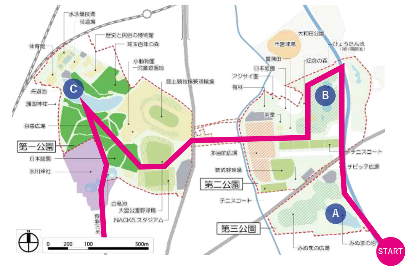 大宮公園、第二・第三公園を実際に歩いたルート