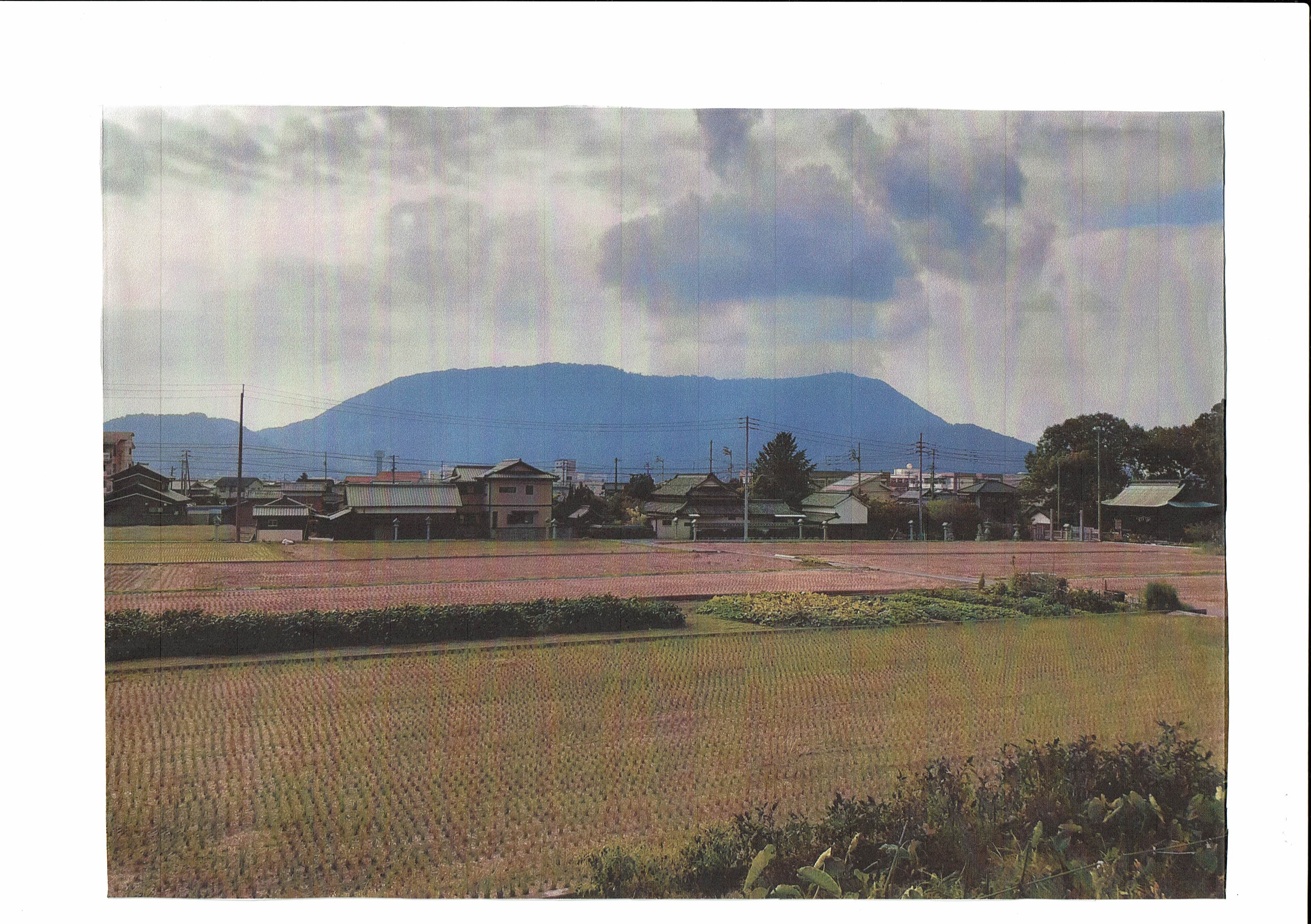 • 左端の琴平山の中腹で中央の電柱の付近に金刀比羅宮の屋根が、肉眼では薄く見える。2020.10.14(筆者撮影)