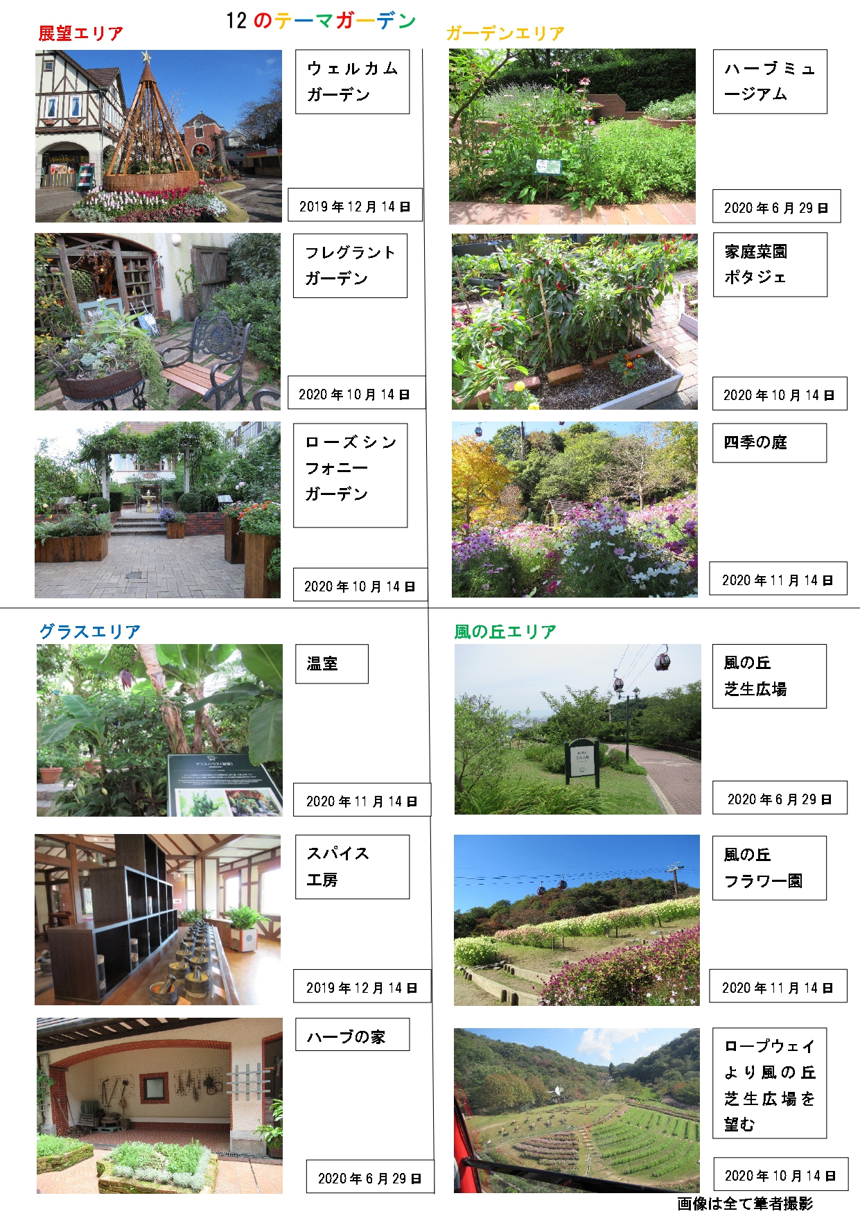 それは、全12のテーマガーデン、ウェルカムガーデン・ローズシンフォニーガーデン・フレグラントガーデン・ハーブが植栽された見本園としての「ハーブミュージアム」・オシャレなキッチンガーデンを提案する「家庭菜園ポタジェ」・グラスハウス・ガーデンテラス・ラベンダー園・ヨーロッパの田舎の風景を取り入れ小屋を設置し工夫している「四季の庭」・オリエンタルガーデン・ユリ園・風の丘フラワー園などからなる。(資料4)