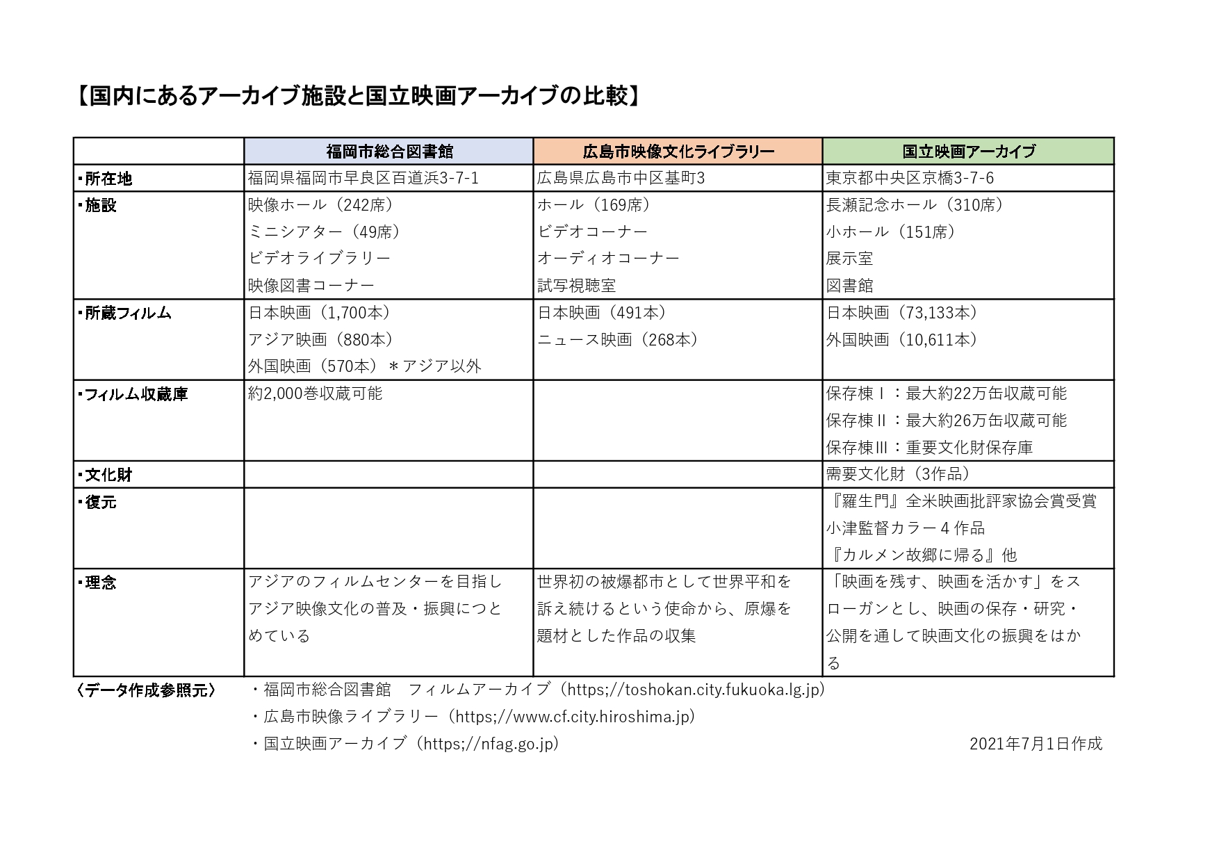 表2:国内にあるアーカイブ施設と国立映画アーカイブの比較(2021年7月1日、筆者作成) -