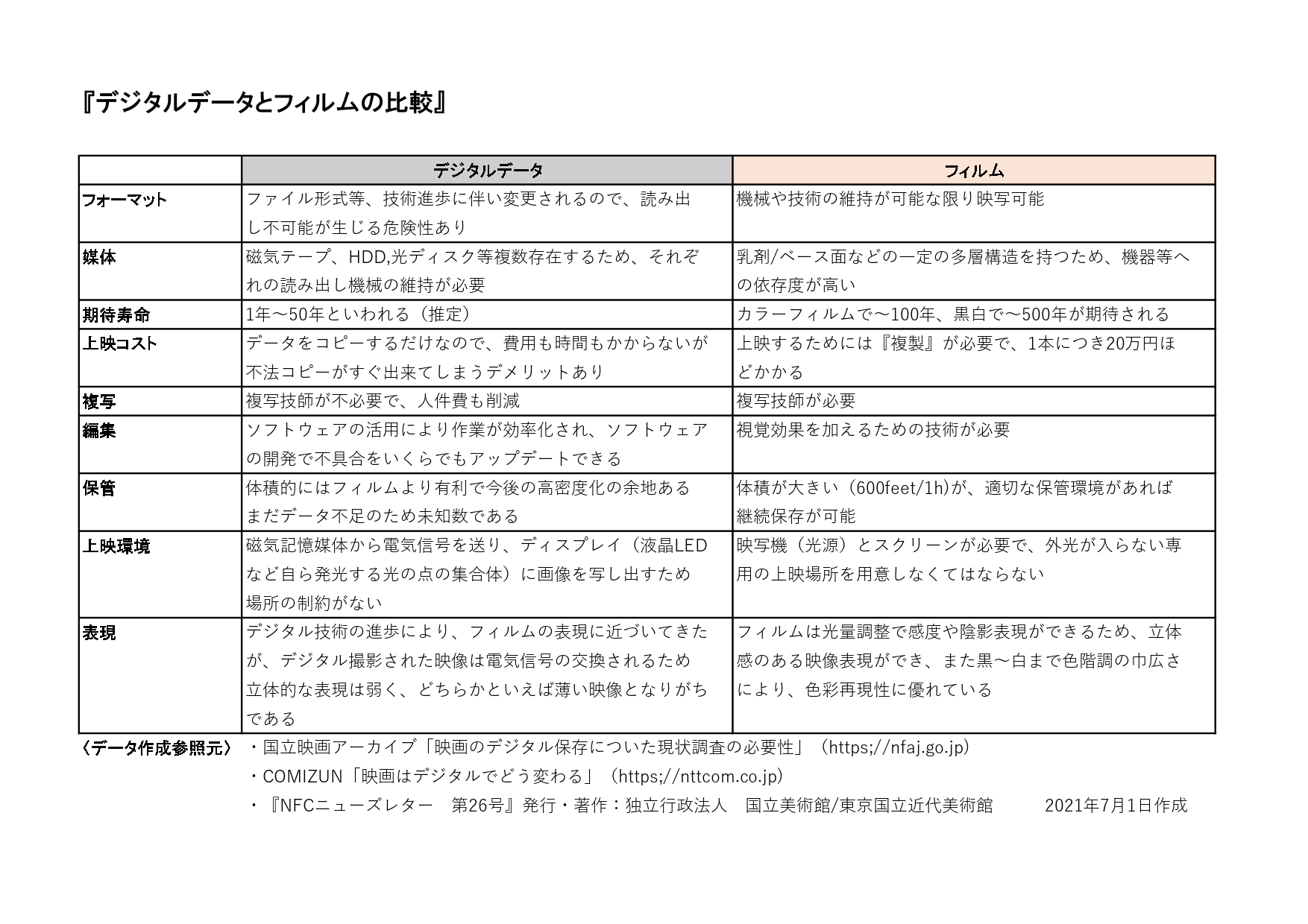 表3:デジタルデータとフィルムの比較表(2021年7月1日、筆者作成)
