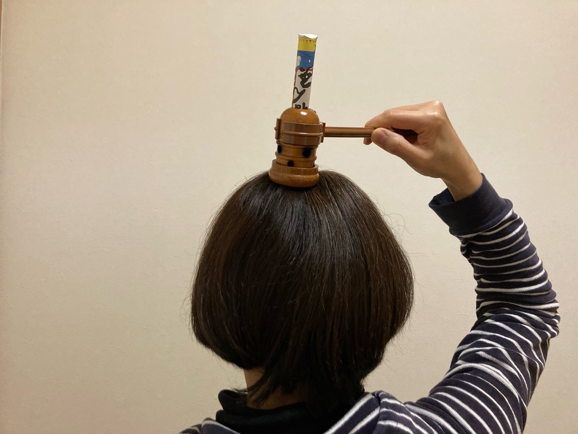 棒灸を頭頂部の百会のツボに据えているところ。棒灸は頭部など直接お灸が出来ないところに使われることが多い。 -
