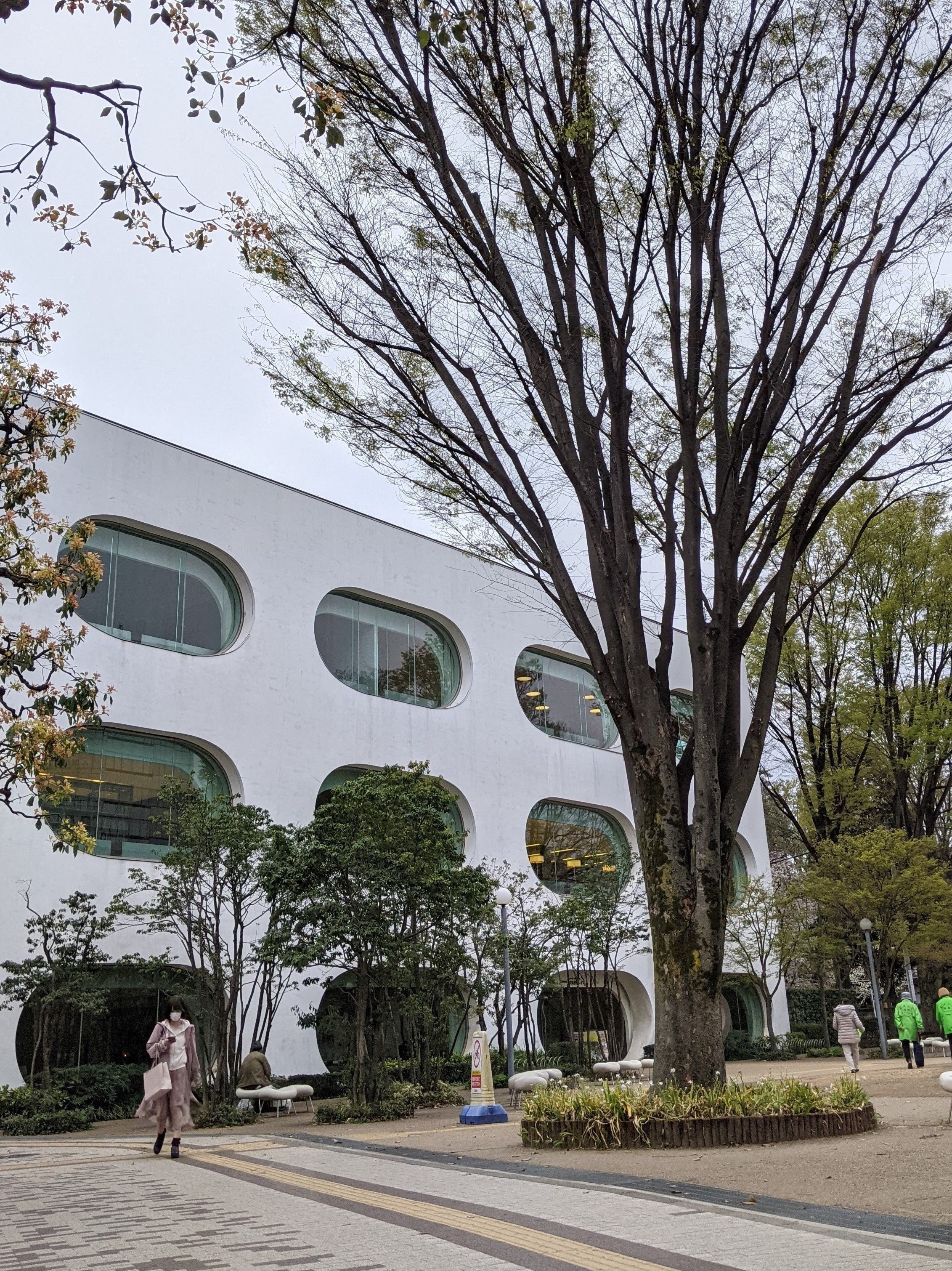 夕方、勤め帰りの人が次々と図書館「武蔵野プレイス」[3]に入っていく。昼下がり、広場の繭型椅子に親子がいる。見上げると建物の窓も繭型だ。