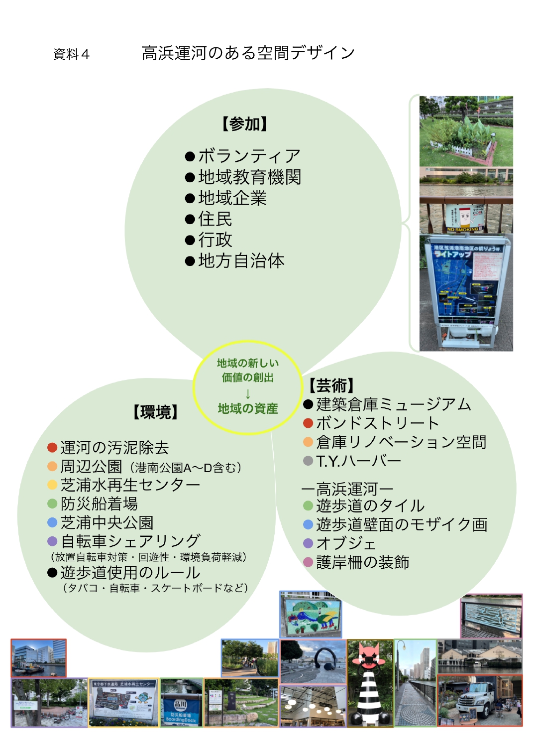 運河は物や人、文化を運び回遊する。港南の歴史文化が、自然環境と結びつき存在するように、高浜運河も地域を癒す公共空間として、住み・働く人との間を連続的につないでいる(資7)。芸術・文化に親しみ、港湾の地形と開放感ある港南に存在するからこそ、区民に歓びを与える場所なのだ。運河自体はコンクリートによる直線的な姿だ。高階秀爾は、日本絵画の特徴を「同一の画面のなかに複数の視点を共存させる考えは、互いに矛盾するさまざまな価値の存在を認める日本文化の多元性に並行する」(33)と語る。それは、運河をとりまく空間を考えるデザインの視点にも通じると言える。