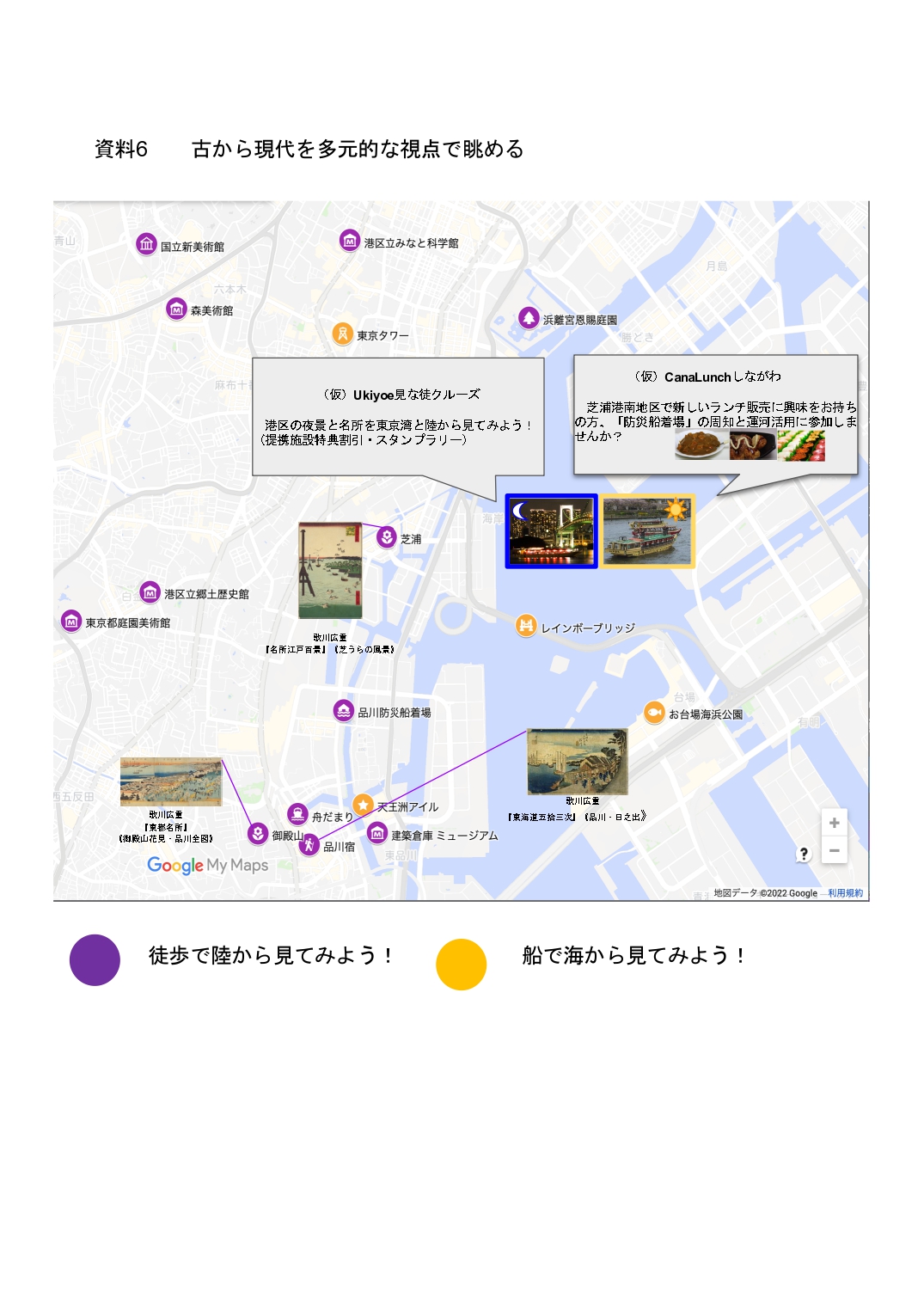 C)2019年の「港区観光動態基礎調査」によると、港区は都内最多の宿泊施設を有し宿泊客は増加傾向(資2②)だ。目的別の満足度は、国内観光客「遊園地、庭園や美術館」外国人は「歴史や伝統文化、生活体験、ポップカルチャー」の順で、共通して夜景がつづく(資2⑥)。港区内外で連携し、お台場・品川間の交通手段と、浮世絵の風景を現代の夜景とともに船と徒歩で巡る「(仮)Ukiyooe 見な徒クルーズ」(資6)で、港南を訪れることが期待できる。提携施設の優待特典、スタンプラリーで促進する。