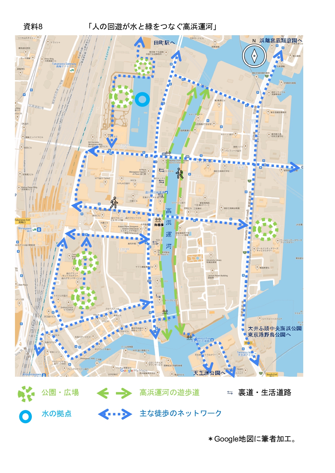 歌川広重(1797-1858)の《東都名所御殿山花見・品川全図》(資1)からは、花見の名所御殿山を後背に、信仰・祭礼(12)・遊興など多彩な活動が行われてきた様子が伝わる(資1)。その画中、陸と海を隔てていた海岸線の先は、現在の港南地区へと姿を変えた。かつて、運河に求められた港湾流通機能は、物流構造の変容により都市部と近接し住宅が混在する市街地化が進む。そのため、運河は防災機能の確保と同時に都市生活における貴重な空間であり、新たな役割が期待される。
