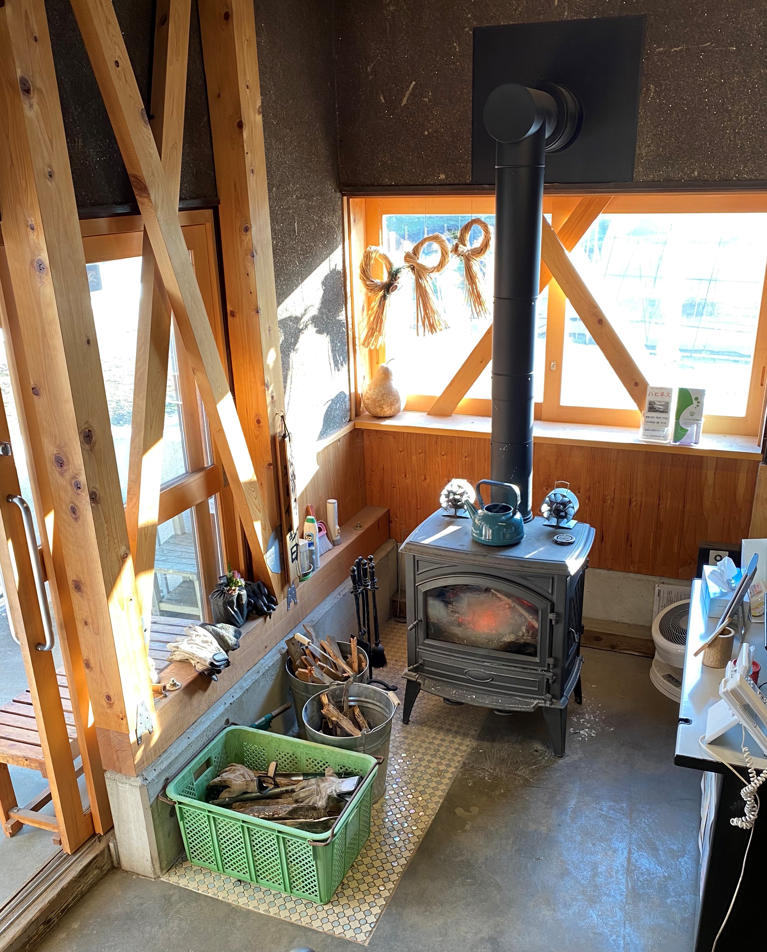 資料3:診療所の玄関を開けるとすぐ、薪ストーブが設置されている。暖かいだけでなく、炎のゆらぎが見えるのも心地良い(2021年12月16日、筆者撮影) -